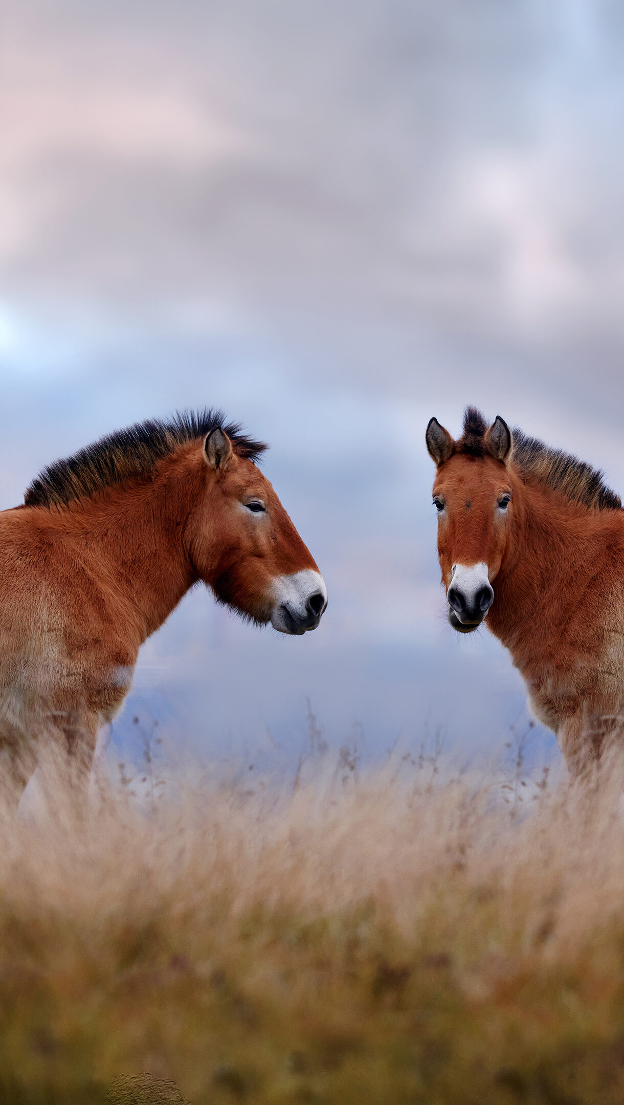 A majestic 4K wallpaper showcasing two wild Przewalski's Horses standing attentively in the tall, golden grass of Hustai National Park, Mongolia. Their sturdy, russet coats and dark manes contrast beautifully with the soft, pastel-toned sky overhead, creating a serene and captivating scene.