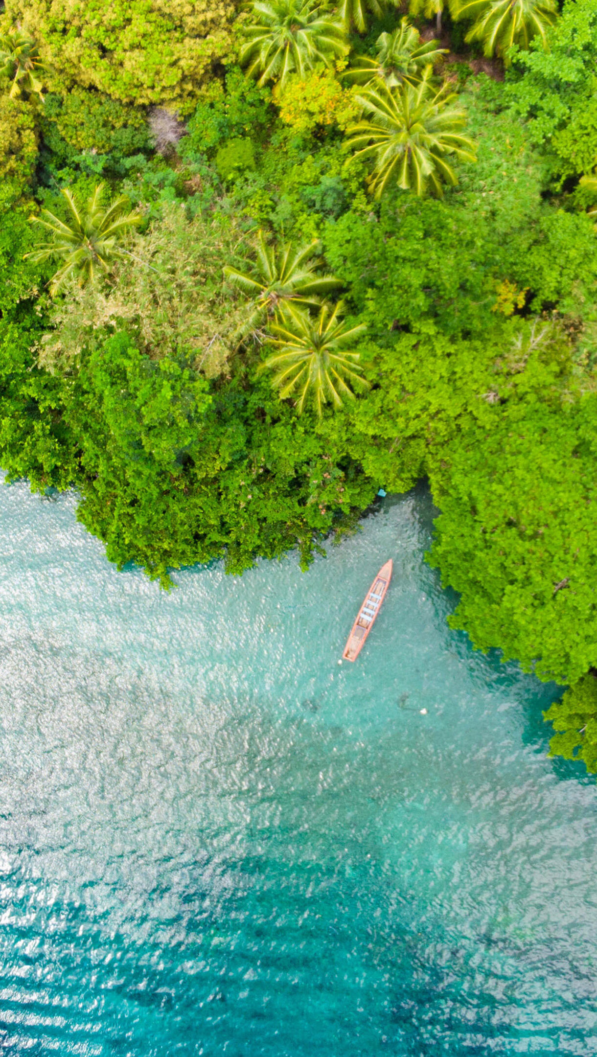 An exquisite 4K wallpaper presents an aerial view of Pulau Ay’s serene blue lagoon and its lush tropical coast. The vibrant turquoise water sparkles under the sun, beautifully contrasting with the dense, verdant island foliage and a solitary boat nestled peacefully near the shore.