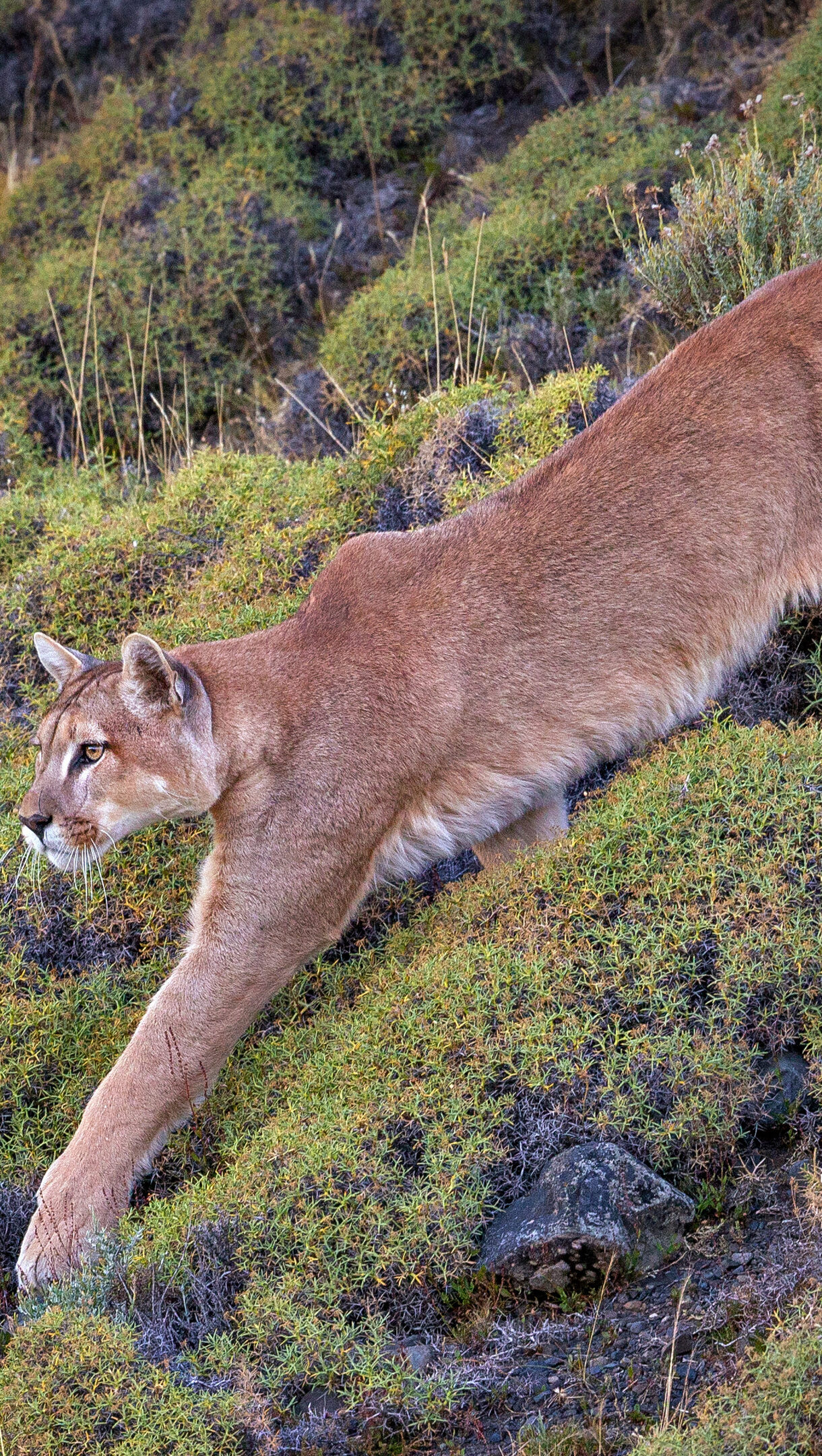 A thrilling 4K wallpaper presents a powerful puma meticulously stalking across a rocky, vegetated slope within Torres del Paine National Park, Patagonia, Chile. Its supple, tawny body is perfectly camouflaged against the sun-drenched greens and browns of the sparse Patagonian scrub, conveying a palpable sense of stealth and focused predation.