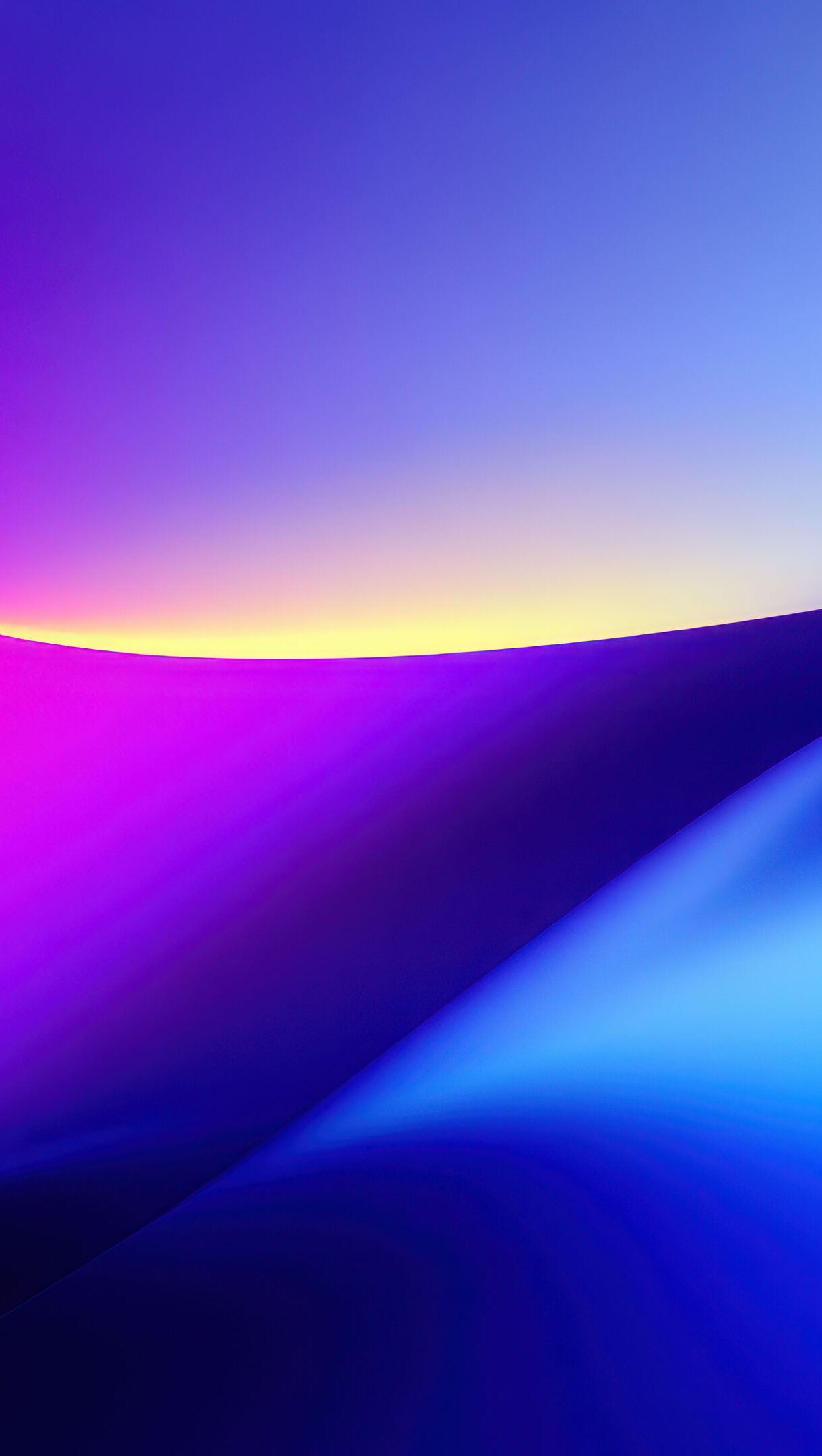 An ethereal 4K wallpaper depicts sweeping, abstract waves crafted through digitl art, transitioning smoothly across the frame. Its vibrant purple, magenta, and blue gradients, highlighted by a luminous golden-yellow ridge, create a serene yet dynamic visual flow.