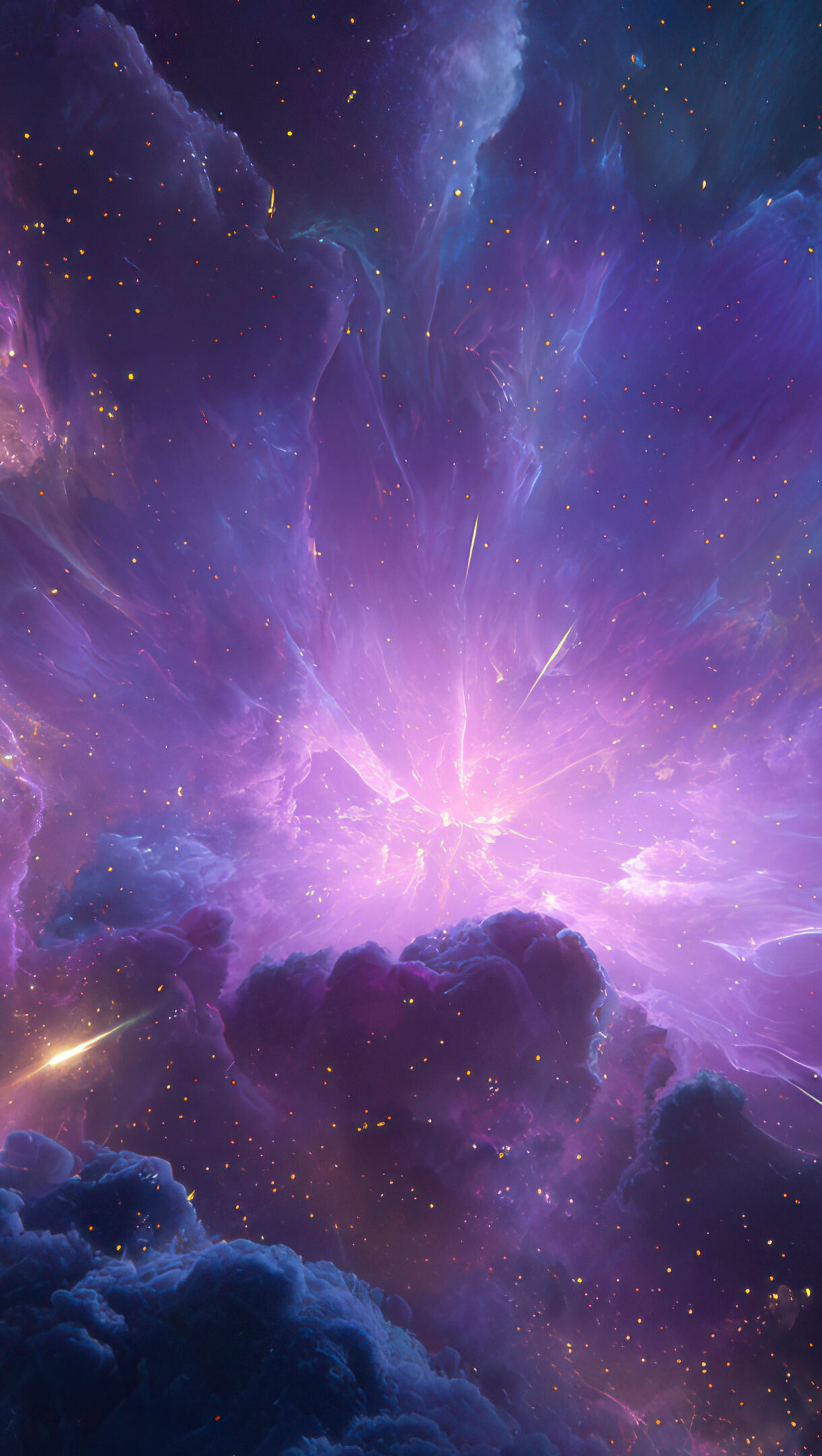 An otherworldly 4K wallpaper of a vibrant cosmic nebula dominating the deep expanse of space, with a dark planet visible in the upper right. A brilliant burst of light at its core illuminates the swirling purple and blue gas clouds, scattering golden starlight and streaks, creating an ethereal and powerful celestial scene.