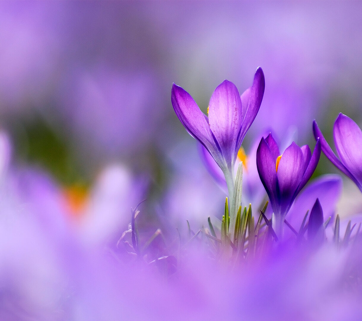 A vibrant 4K wallpaper showcases a field of purple crocus flowers in full bloom. The striking contrast between the sharply detailed petals and the soft, dreamy bokeh background creates a magical sense of spring's gentle awakening.
