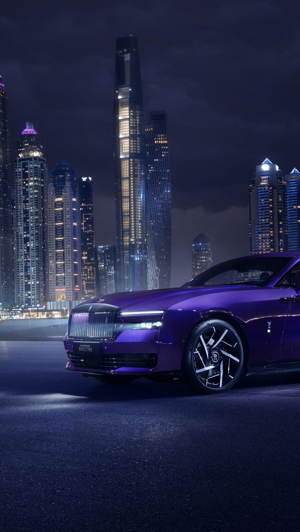 A dramatic 4K wallpaper featuring a sleek purple Rolls-Royce Black Badge Spectre parked against the illuminated Dubai city skyline at night. Its vibrant purple finish brilliantly contrasts with the glittering skyscraper lights, creating a sophisticated and powerful nocturnal scene.