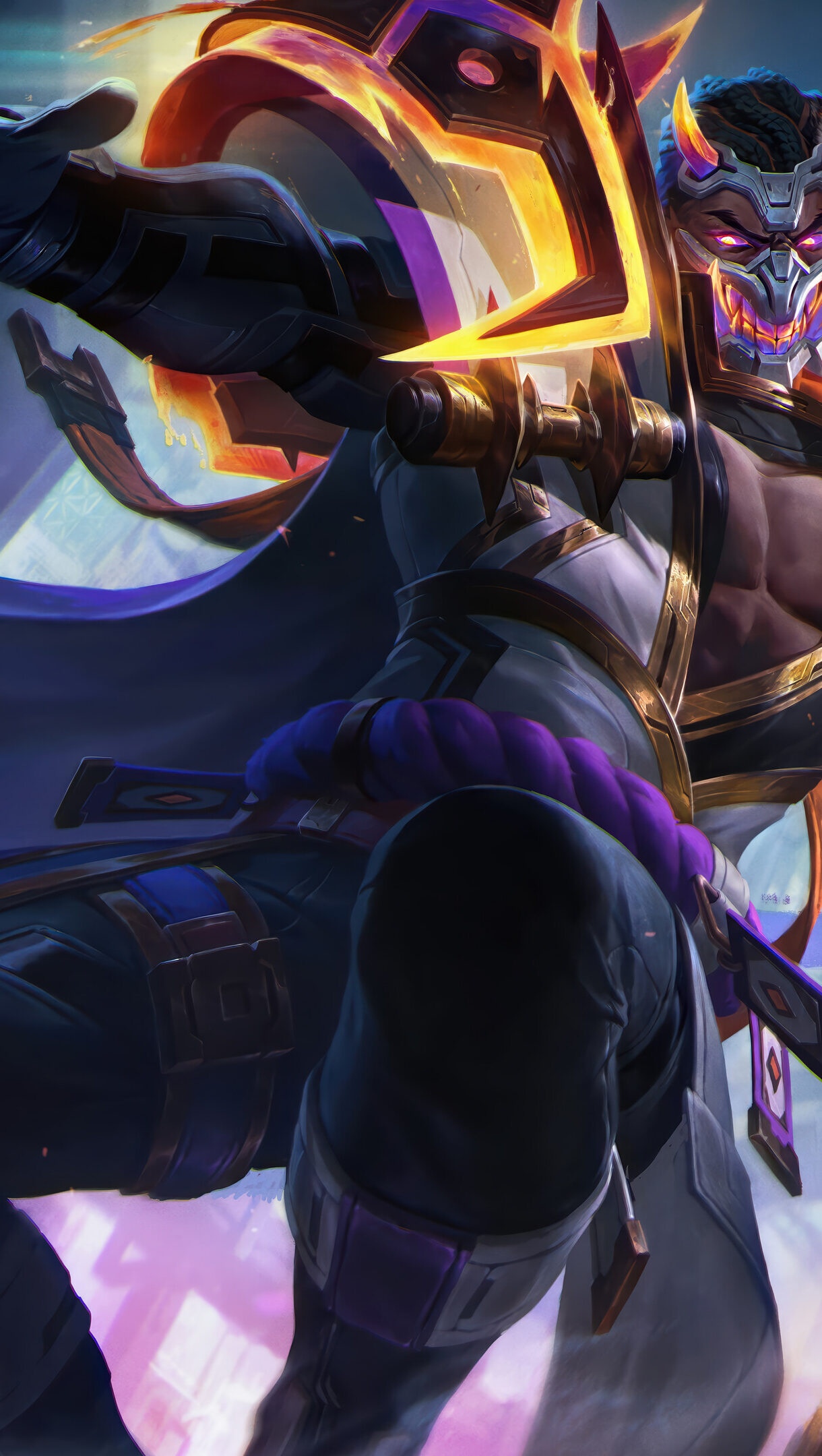 A dynamic 4K wallpaper of Pyke in his Inkshadow skin, a fierce masked warrior with glowing eyes and horns, wielding twin fiery blades in a striking pose against a backdrop of swirling dark energy. The vivid contrast between the glowing orange and purple blades and his ominously lit mask against the dark, swirling ink-like energy creates an intense and otherworldly atmosphere.