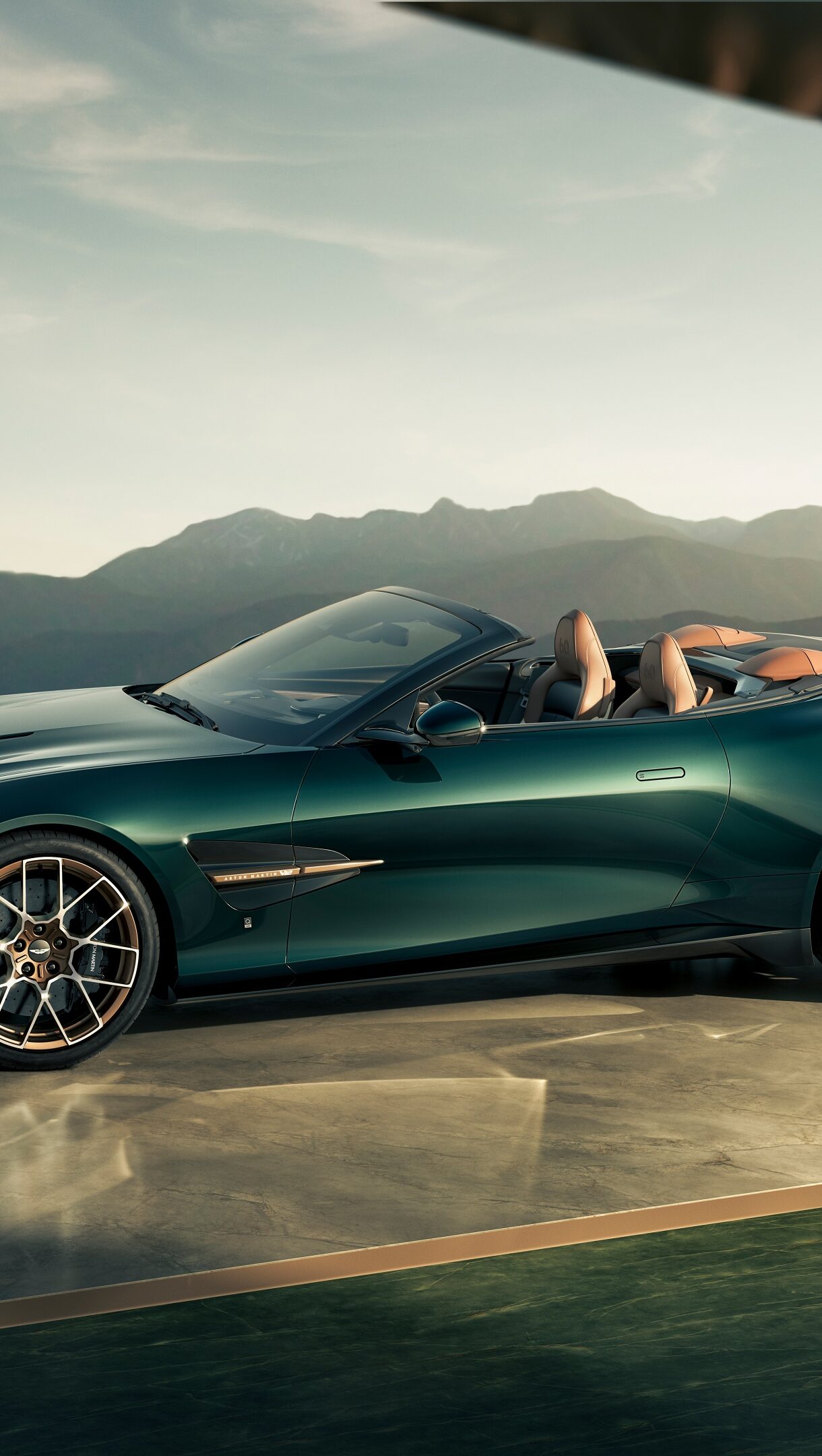 An exquisite 4K wallpaper capturing a dark green Q by Aston Martin Vanquish Volante convertible parked on a sophisticated platform, set against a majestic mountain range at sunset. The car's deep metallic green finish beautifully reflects the warm, golden light of the declining sun, creating a luxurious and serene mood across the dramatic landscape.