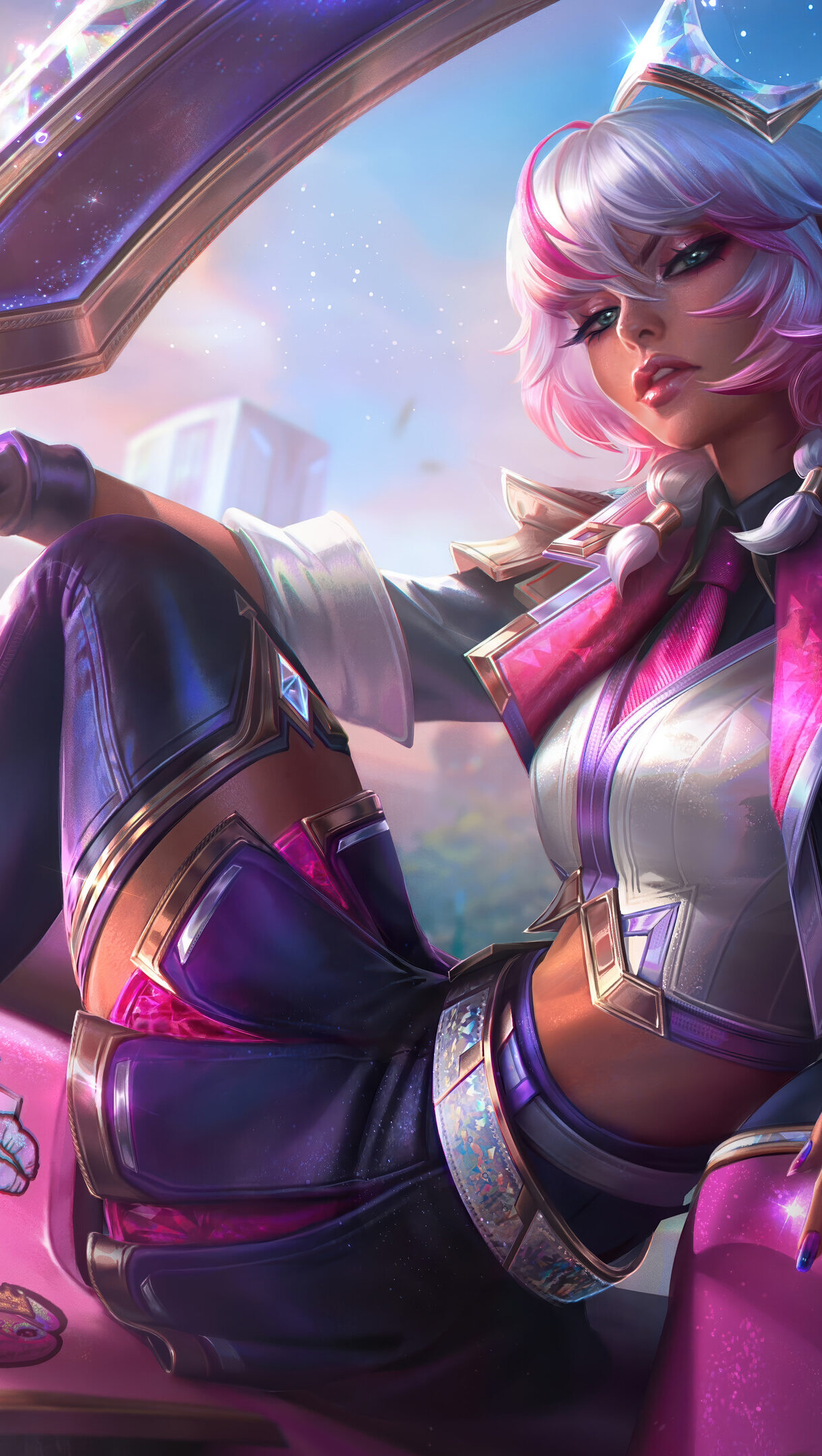 A captivating 4K wallpaper showcasing Qiyana, in her elaborate Battle Academia Prestige skin, lounging confidently on a sleek pink hoverbike within a brightly lit, modern academy campus. Her sparkling crystalline crown and grand ring blade glint under the ethereal, sunlit sky, emphasizing her regal and powerful presence amidst a shower of light particles.