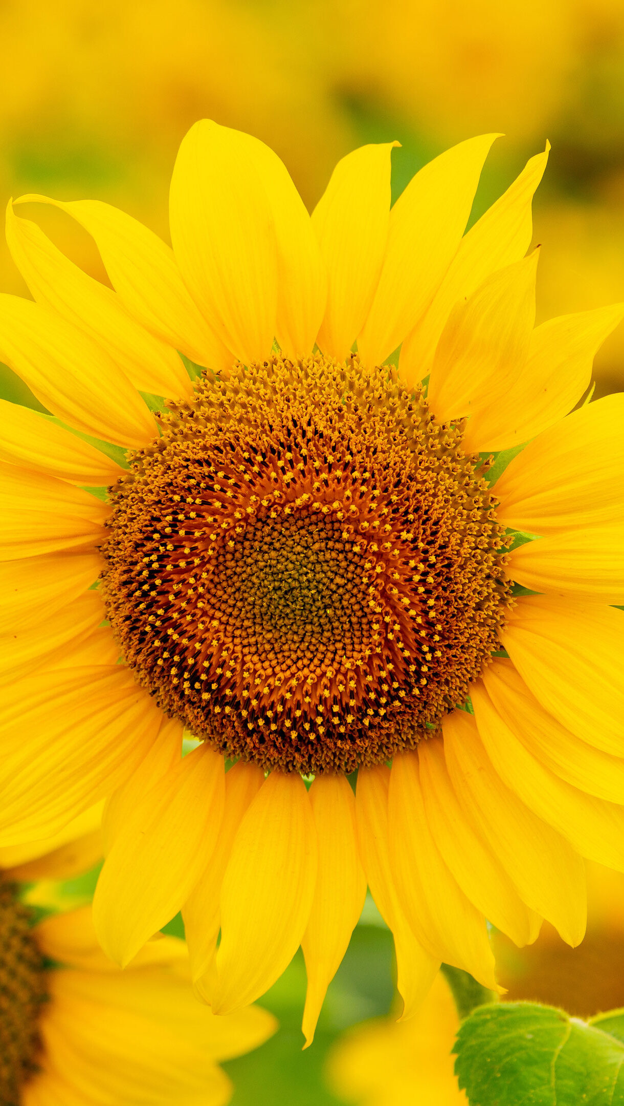 A magnificent 4K wallpaper showcasing a radiant sunflower prominently centered in a vast, sun-drenched golden field. Its vibrant yellow petals and intricate brown seed head glow softly against the blurred backdrop of countless other sunflowers, creating a warm and inviting summer scene.
