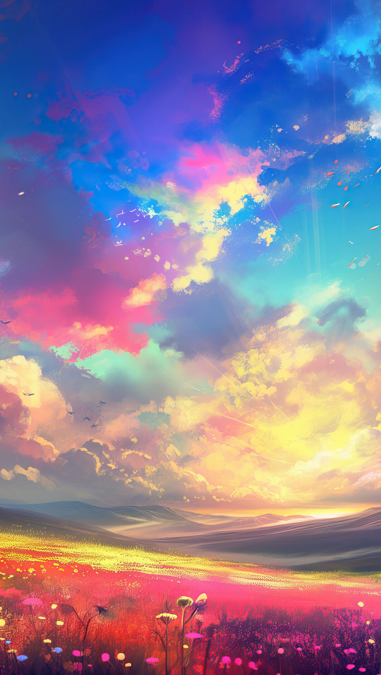 A mesmerizing 4K wallpaper unfolds, featuring a breathtaking scene of rainbow-colored clouds hovering above lush flower fields, all brought to life through AI generation.