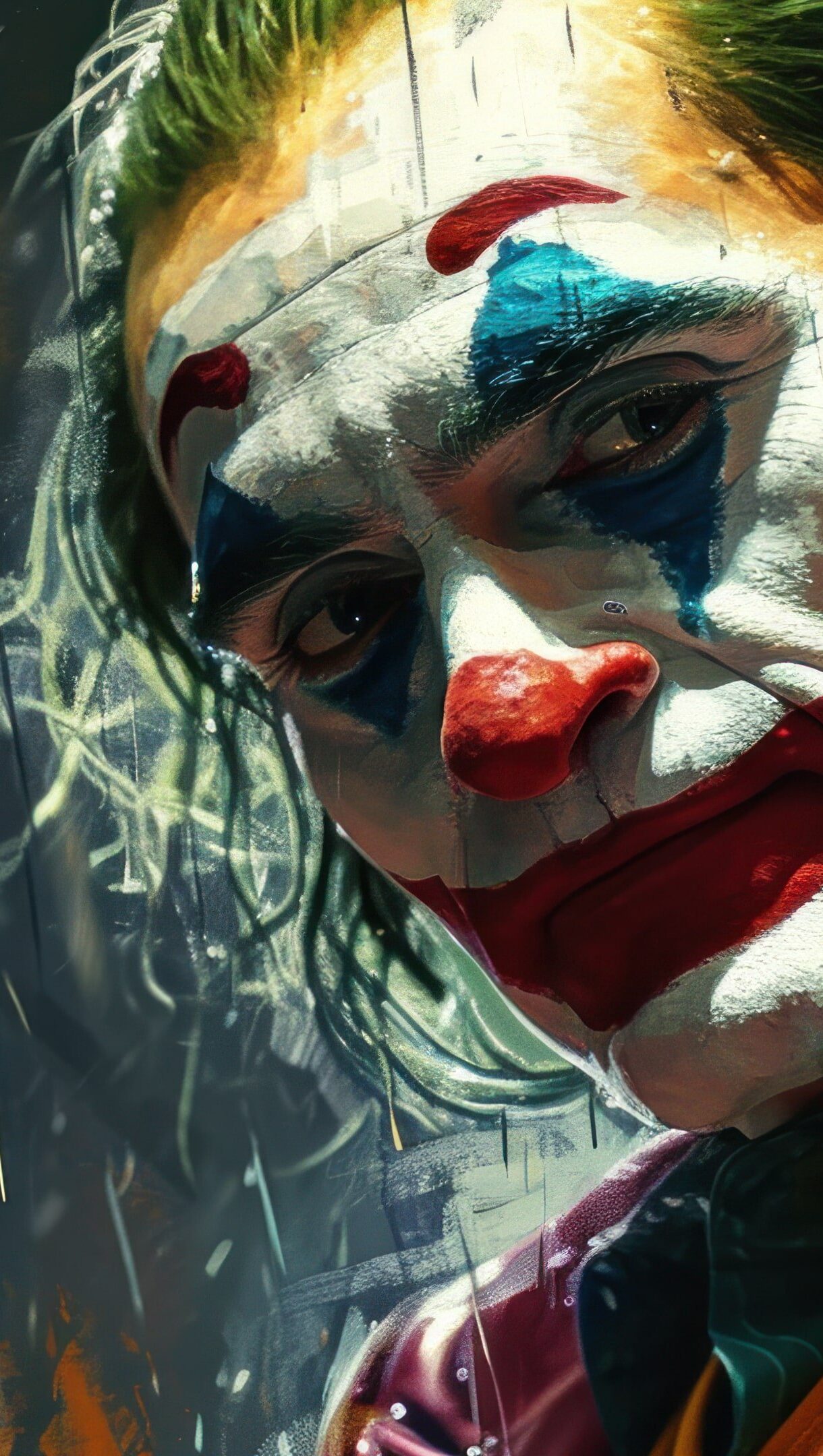 An intriguing 4K wallpaper featuring an AI-generated portrait of the Joker amidst a rainy ambiance. The painting captures the enigmatic essence of the character, blending artistry with a moody, rain-soaked backdrop. Simply click the download button to bring this masterpiece to life on your screen as a desktop wallpaper or save it for later in your wallpaper collection.