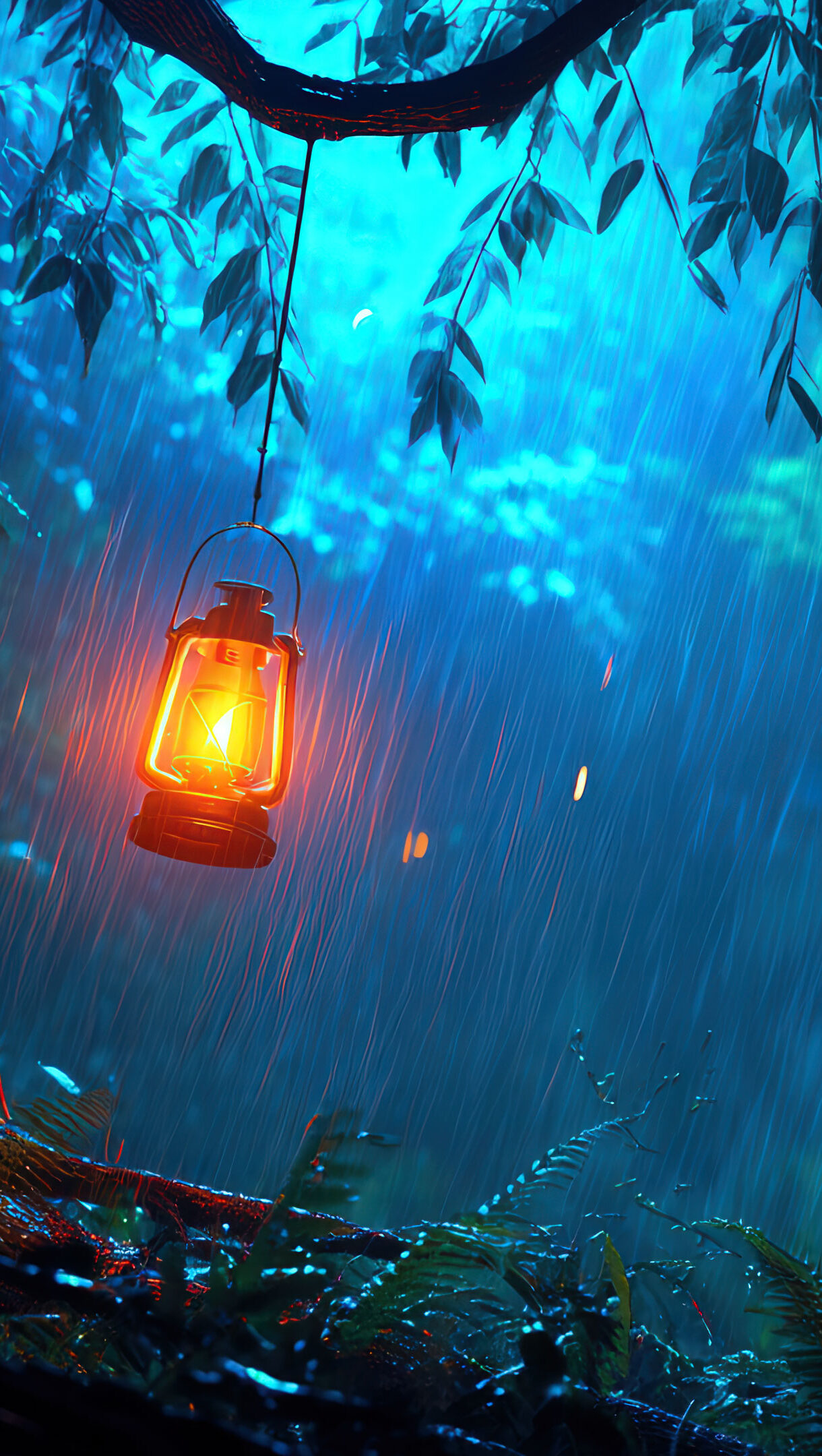 A mesmerizing 4K wallpaper capturing a rainy night illuminated by a glowing lantern. Soft raindrops glisten in the dim light as shadows dance on wet cobblestones, evoking a serene and moody atmosphere.