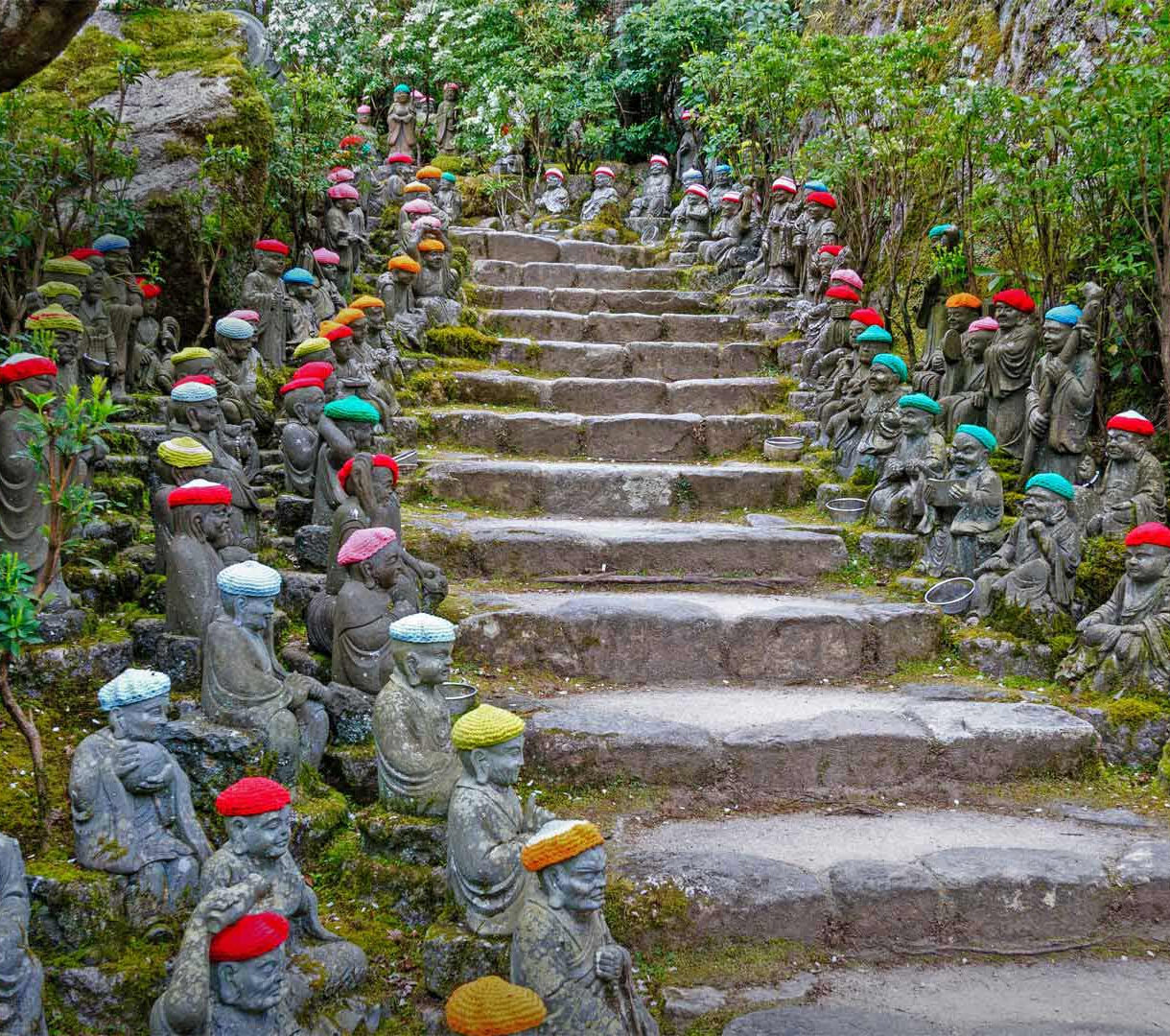 A delightful 4K wallpaper showcases numerous Rakan statues lining a moss-covered stone staircase at the Daisho-in Temple on Miyajima Island, Japan. The cheerful array of multi-colored knitted hats adorning each statue offers a striking visual element, bringing a playful warmth to the ancient, verdant temple environment.