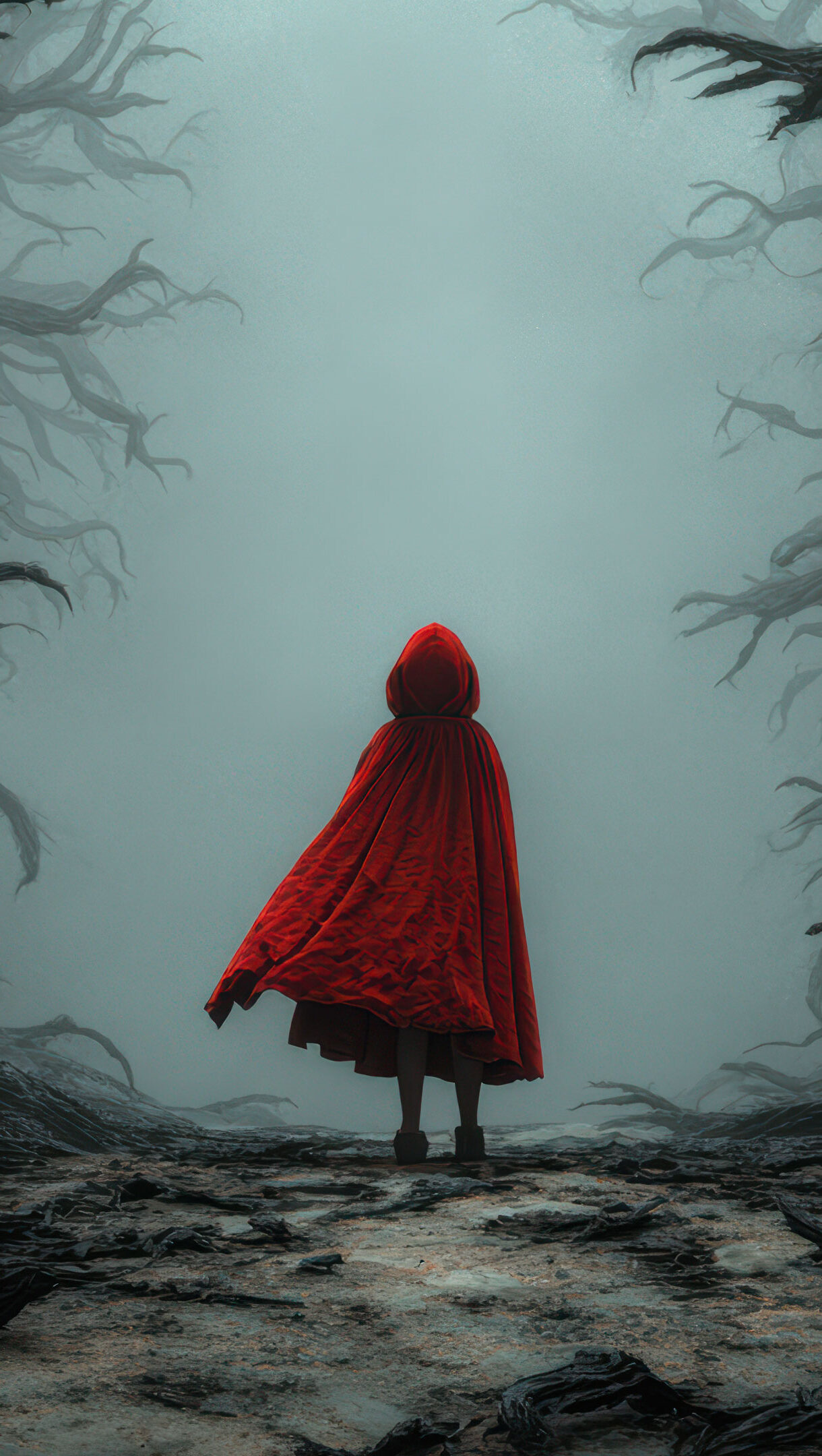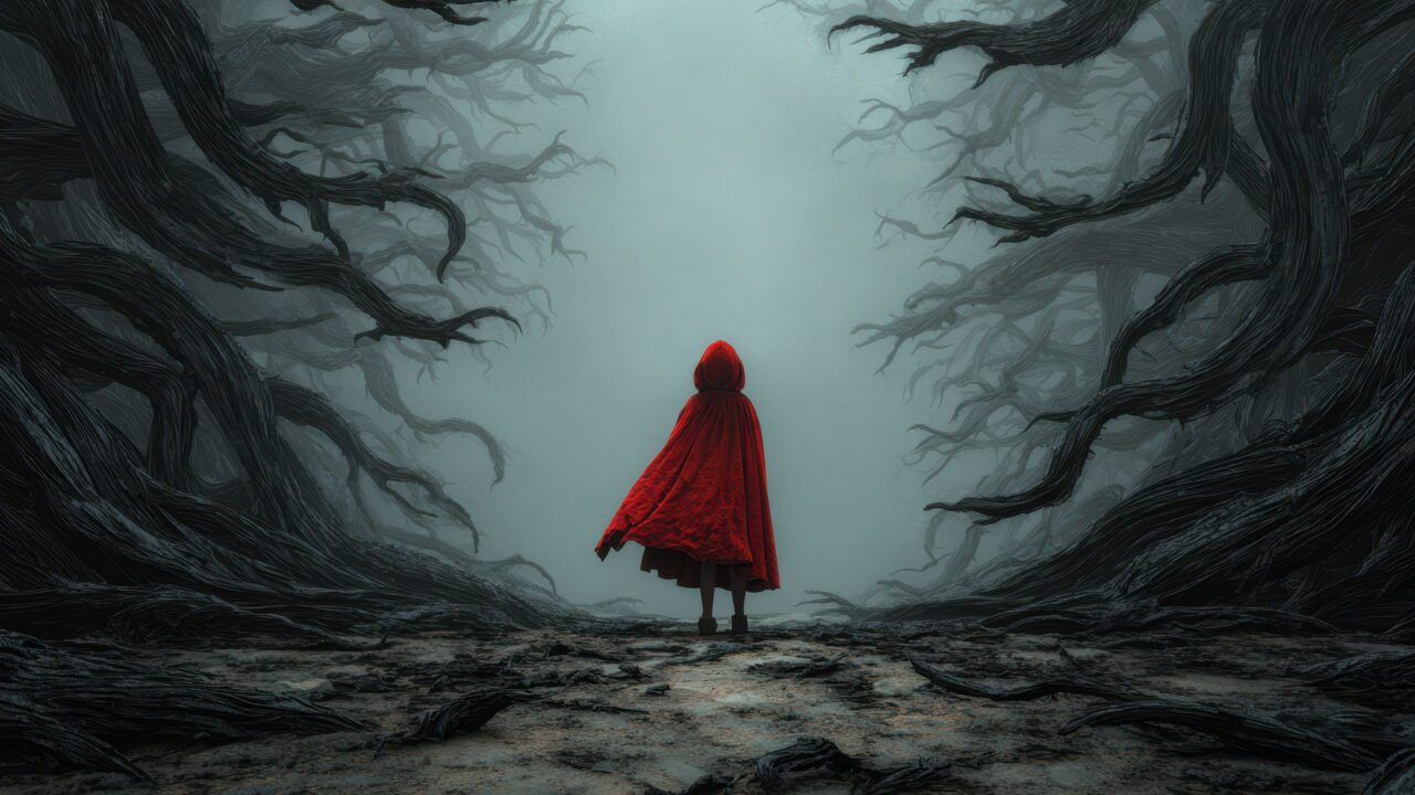 An immersive 4K wallpaper features a solitary figure in a flowing red cloak embarking on a journey through a dense, shadowy forest, a landscape crafted as intricate digital art. The stark contrast of the vibrant red against the oppressive, muted grays and deep blacks of the tangled branches creates a sense of mysterious solitude and epic adventure.
