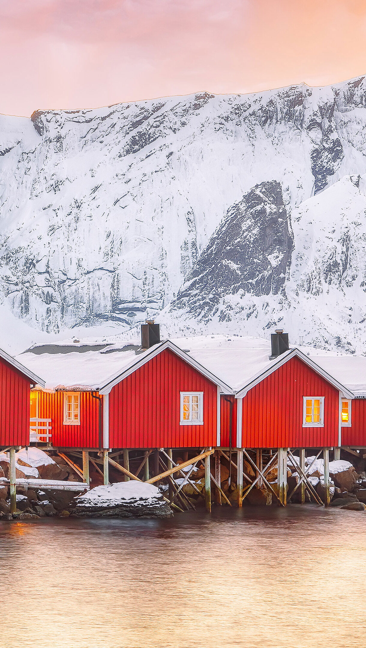 Red Fishermen’s Cabins On Reinefjorden Shore With Snowy Mountains At Sunset Wallpaper