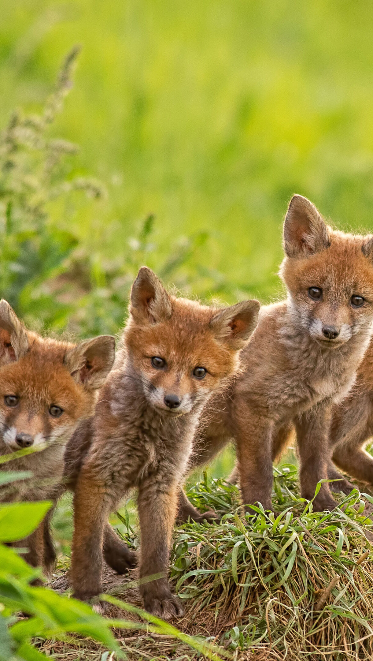A captivating 4K wallpaper featuring a group of adorable Red Fox cubs peeking out from their den entrance in a vibrant green, grassy landscape. Their inquisitive eyes and soft, sunlit orange-red fur stand out charmingly against the softly blurred natural background.