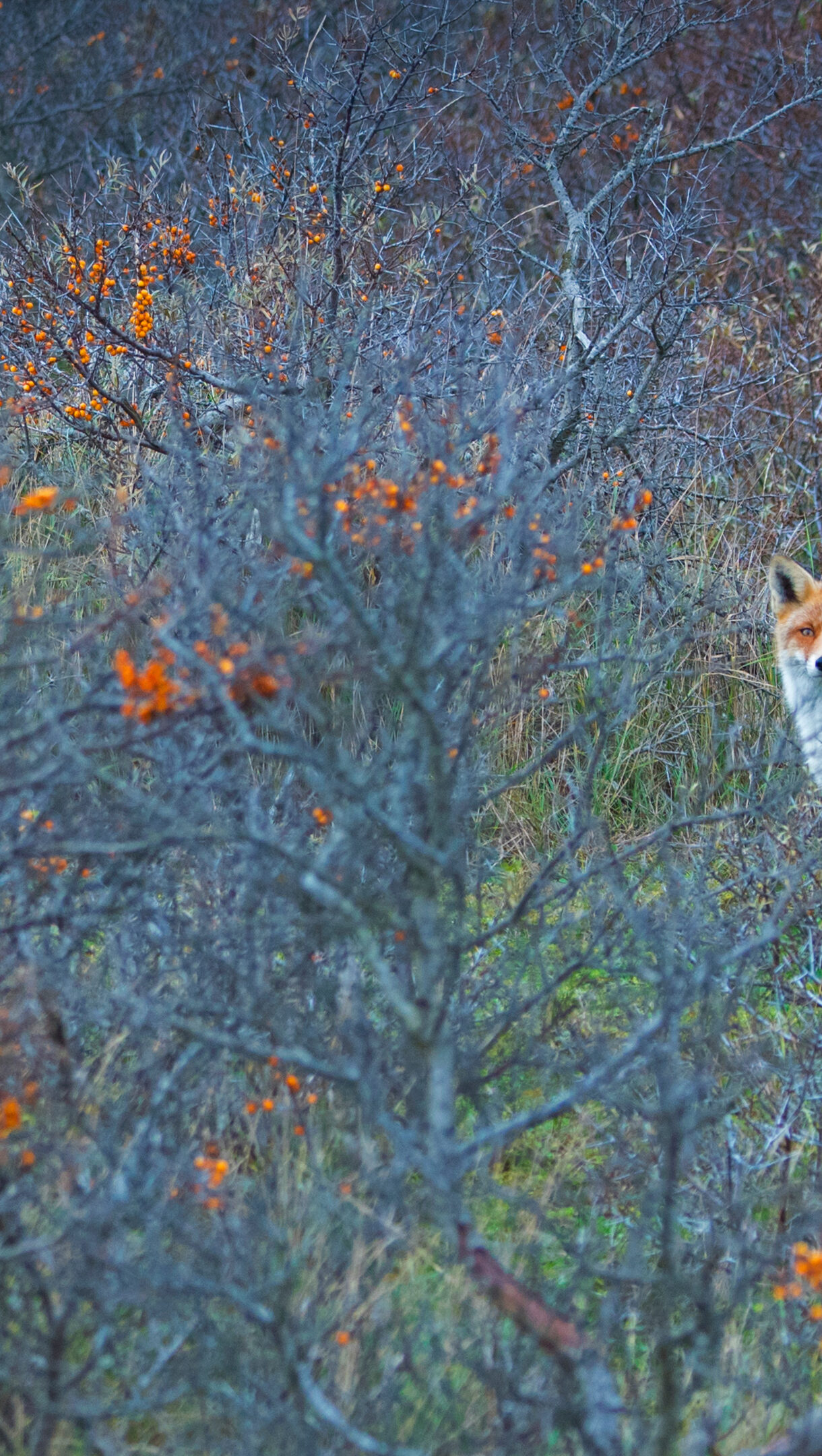 A captivating 4K wallpaper showcasing a Red Fox sitting alertly amidst dense sea buckthorn bushes in the Amsterdamse Waterleidingduinen. Its vibrant reddish-orange fur stands out against the muted blues and greys of the spiky, berry-laden branches, with the fox's piercing gaze fixing calmly on the viewer.
