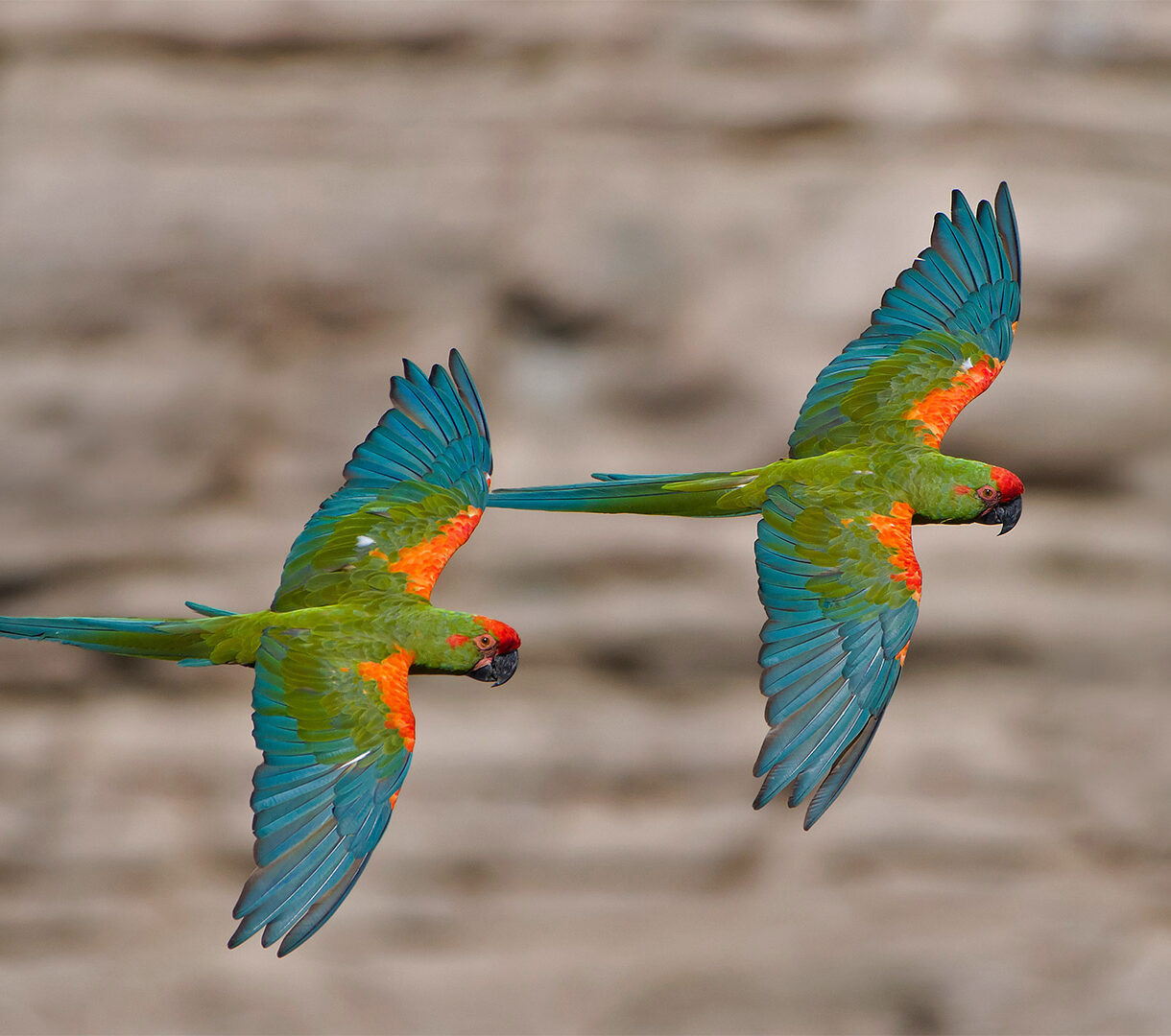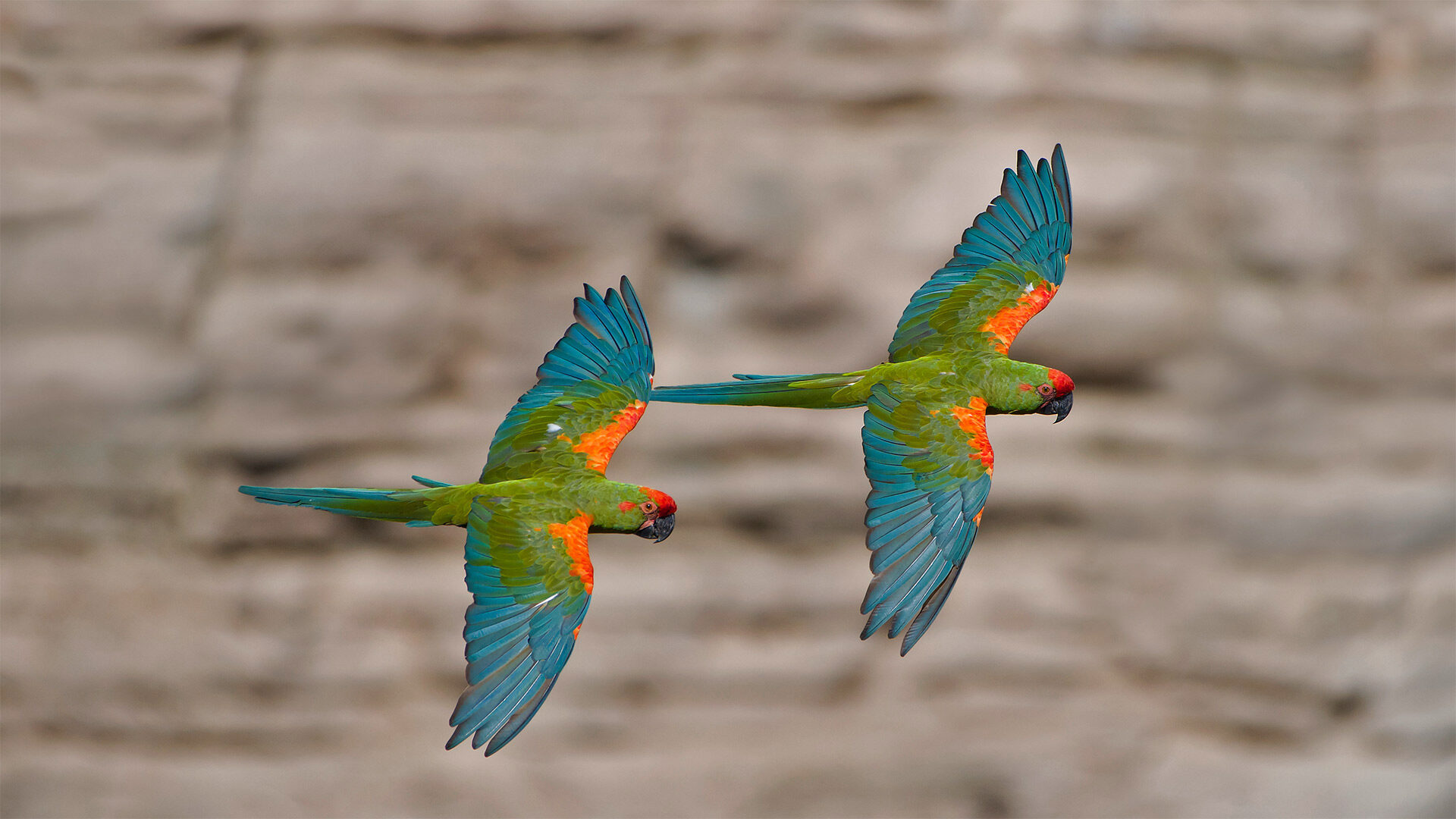 A captivating 4K wallpaper showcasing two Red-fronted Macaws in graceful flight against a subtly blurred, natural rock face in Bolivia. Their vibrant green, red, and blue plumage creates a striking contrast with the muted background, emphasizing their powerful, synchronized wingbeats and the dynamic freedom of their movement.