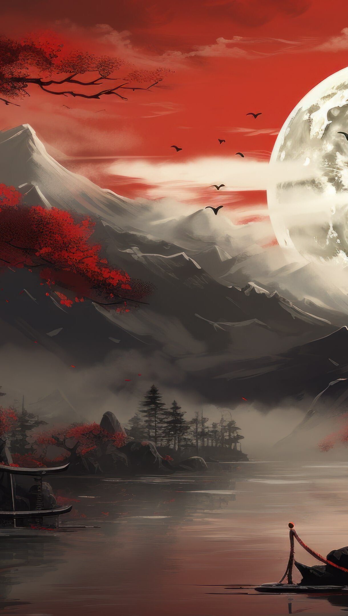 An exquisite 4K wallpaper created by AI, featuring a red Japanese mountain painting that beautifully captures the essence of traditional art and the serene beauty of Asian landscapes, perfect for enhancing your desktop background. Simply click the download button to bring this masterpiece to life on your screen as a desktop wallpaper or save it for later in your picture collection.