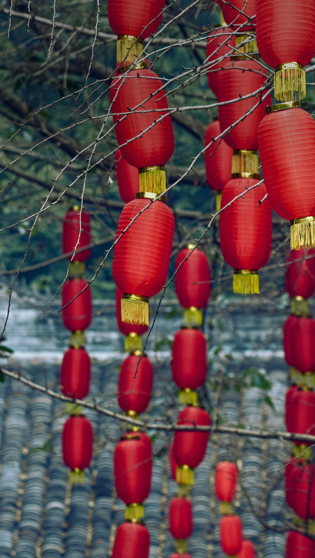 A festive 4K wallpaper displaying numerous red lanterns with golden tassels hanging from the bare branches of trees in Chengdu during the Lantern Festival. The vivid red of the lanterns creates a celebratory and inviting atmosphere against the blurred traditional tiled rooftops and muted foliage.