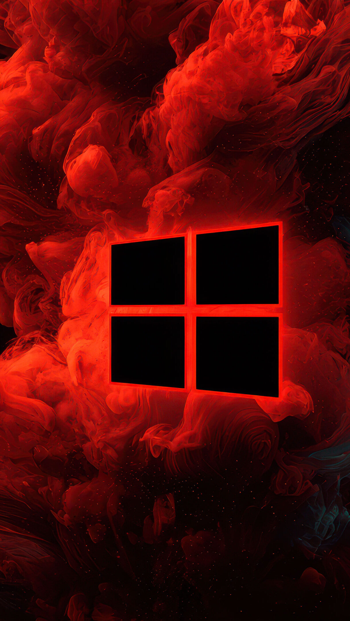 A powerful 4K wallpaper showcasing a bold, glowing red Windows logo at its center, enveloped by swirling, vibrant red and subtle dark teal smoke against a pitch-black background. The fiery red smoke billows outwards with a mesmerizing, ethereal texture, making the red-outlined icon appear to emerge from a passionate, chaotic energy.