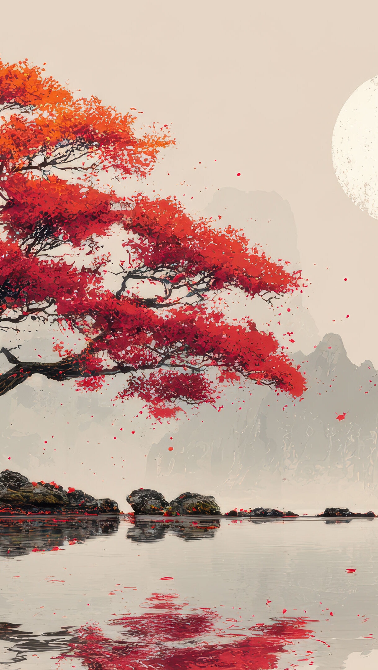 A captivating 4K wallpaper featuring a majestic red-leafed tree, evocative of classic Japanese art, rooted on a rocky lakeside shore under a large, soft moon and flanked by distant misty mountains. The tree's vibrant crimson foliage creates a striking contrast against the muted, ethereal landscape, with its fiery leaves scattering onto the reflective water surface, adding a poetic, tranquil beauty.