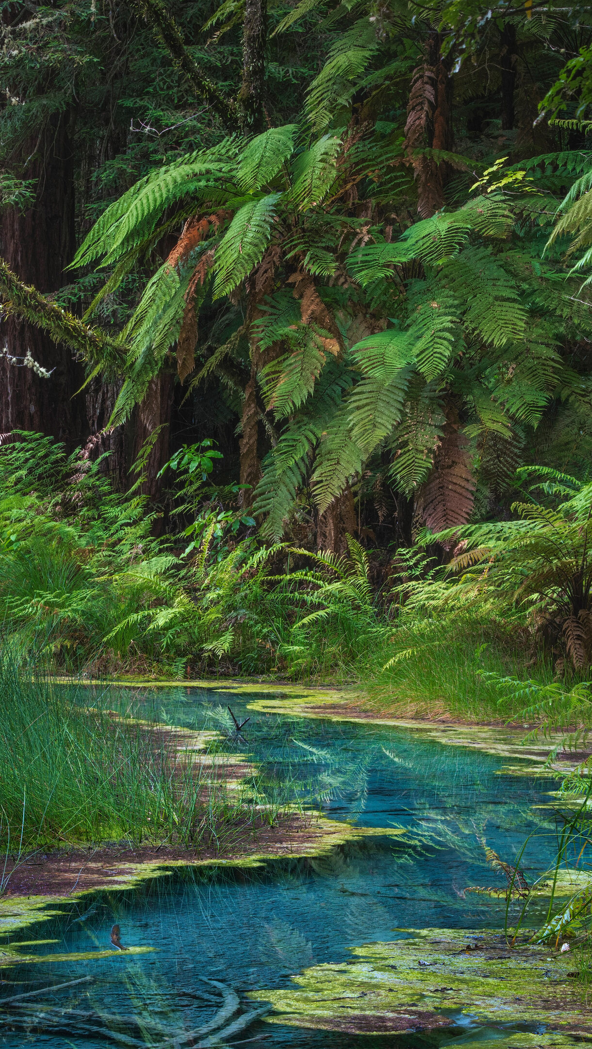 An immersive 4K wallpaper showcasing the serene beauty of the Redwood Memorial Grove in Whakarewarewa Forest, where towering redwoods and lush ferns frame a winding stream. The tranquil, aquamarine waters of the stream, bordered by rich green ferns and dark moss, reflect the forest canopy, creating a deeply peaceful and ancient atmosphere.
