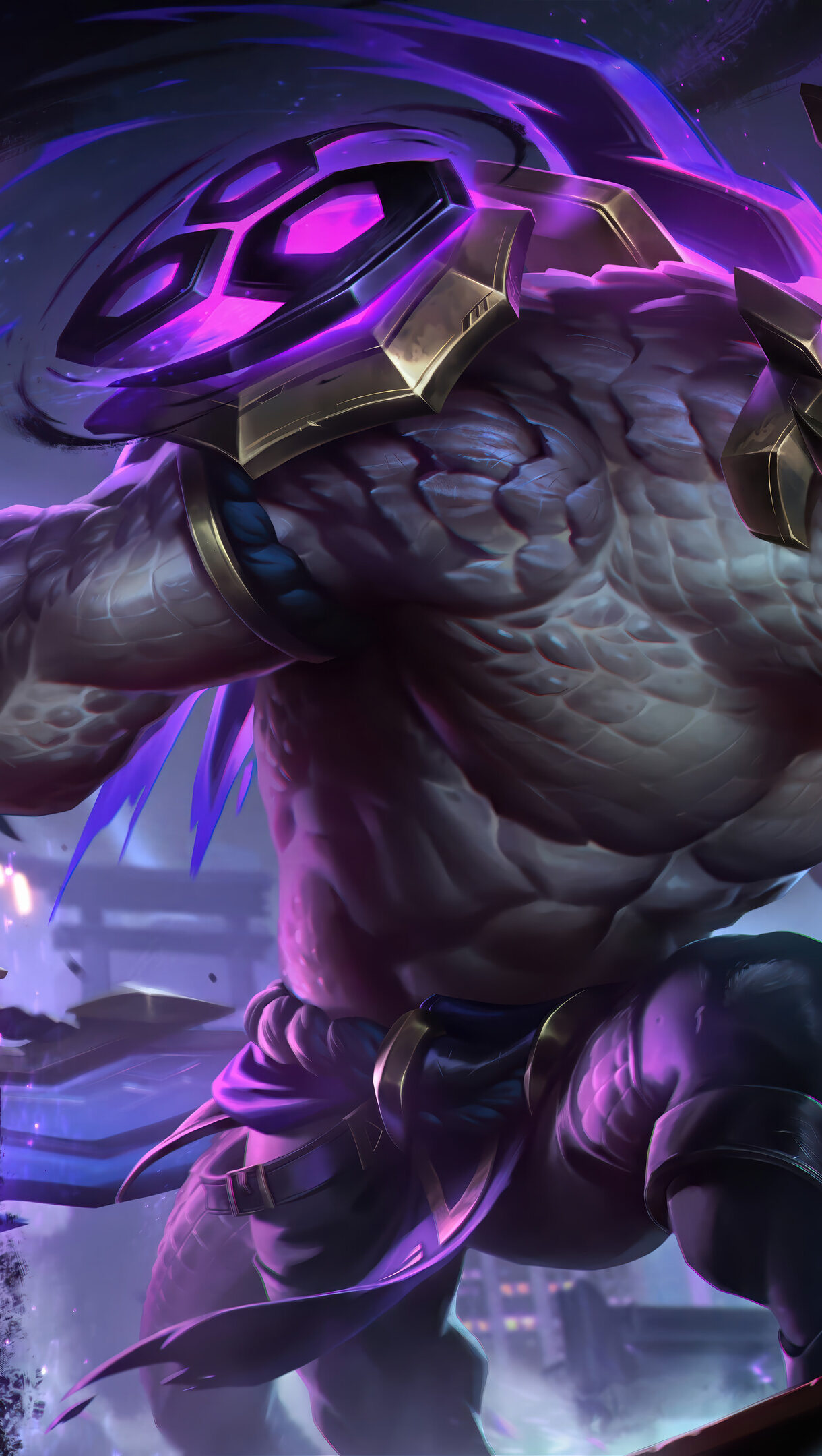 A mystical 4K wallpaper showcasing Renekton in his Inkshadow skin, a colossal reptilian warrior, poised aggressively atop a futuristic urban skyline at night. His glowing yellow maw and vibrant purple-infused weapon emanate dark, brushstroke-like energy, creating a powerful and ominous atmosphere against the city's muted lights.