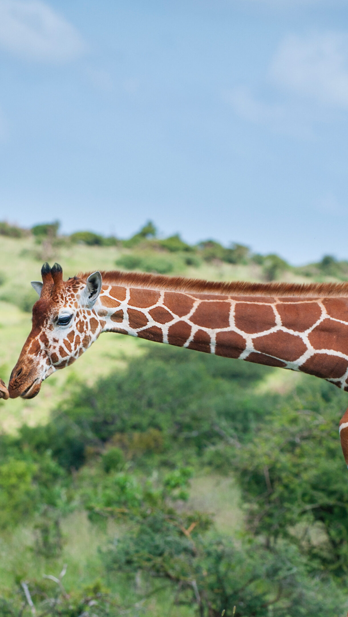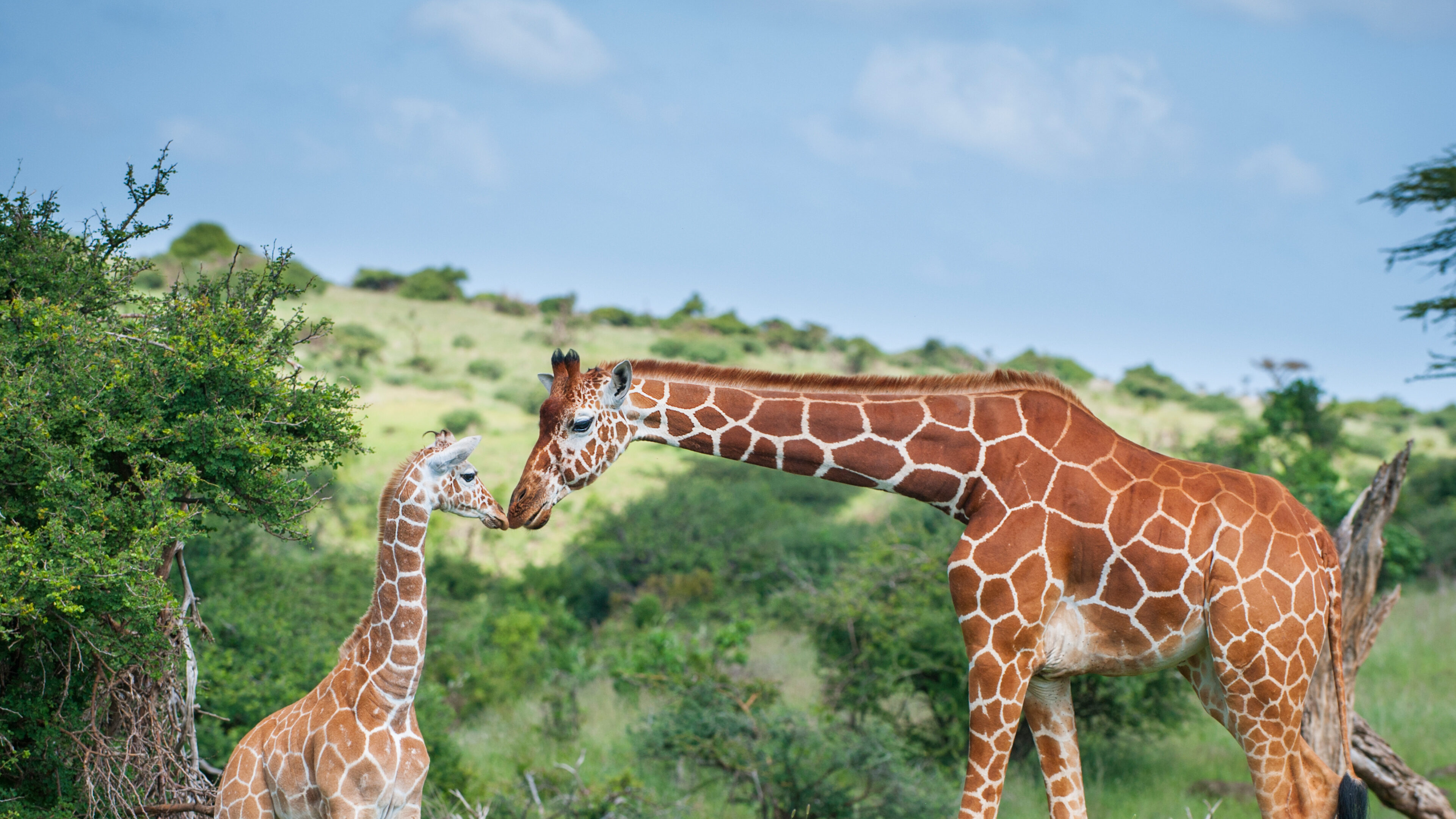 A captivating 4K wallpaper presenting a Reticulated Giraffe mother gently greeting her calf in a sun-drenched wildlife savanna. Their close, affectionate nuzzle beautifully highlights their distinctive patterns and the serene bond against a backdrop of vivid green foliage and a clear blue sky.