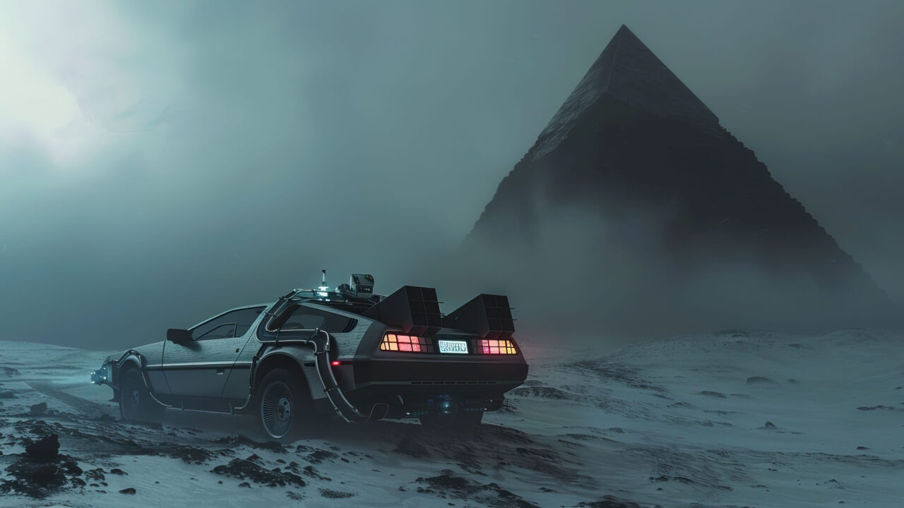 A mesmerizing 4K wallpaper featuring a vintage car parked in an eerie landscape under the dusky sky. The retro car stands out against the haunting backdrop of barren trees and mysterious surroundings, creating a surreal atmosphere. Ideal for adding a touch of nostalgia and mystery to your desktop or mobile screen.