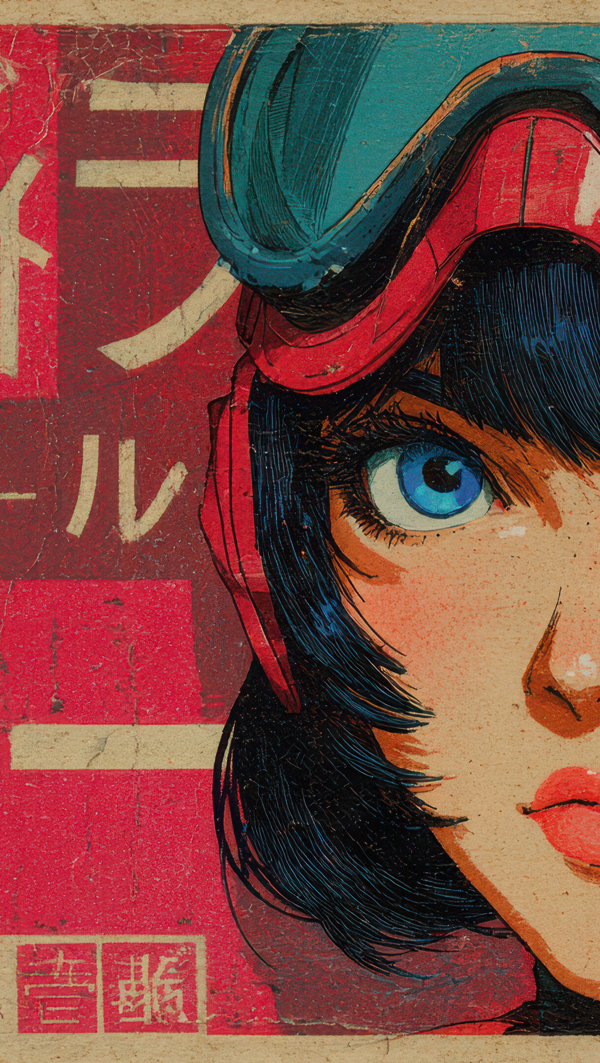 A striking 4K wallpaper presents a retro manga-style woman, her face framed by a bold red helmet and vibrant blue goggles, set against a distressed red background with Japanese text. Her intense blue eyes, mirroring the goggles pushed above, and the gritty, textured appearance of the artwork define the image's vibrant, nostalgic mood.