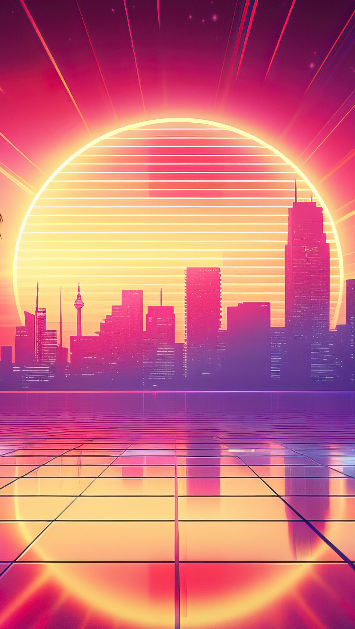 A vibrant 4K wallpaper featuring a retro cityscape at sunset. The neon-lit skyline and glowing horizon capture the essence of an 80s aesthetic, blending synthwave and vaporwave styles to create a mesmerizing, nostalgic atmosphere. Perfect for adding a touch of retro flair to your desktop or mobile screen.