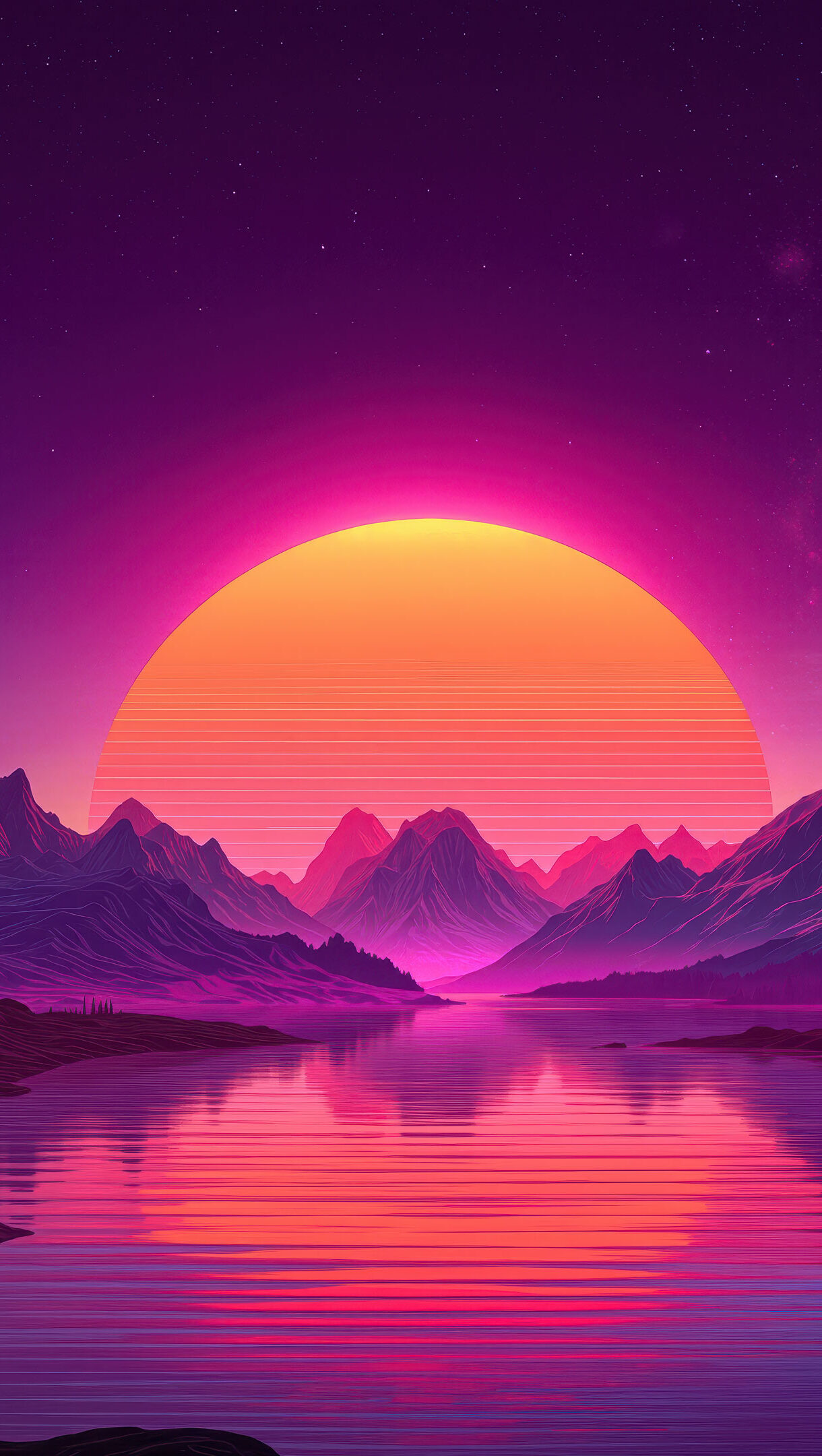 An electrifying 4K wallpaper showcases a breathtaking retrowave mountain lake sunset scene. Majestic purple mountains frame a calm lake, reflecting a colossal, glowing orange sun marked with horizontal lines, all under a gradient night sky dotted with stars and a subtle crescent moon.
