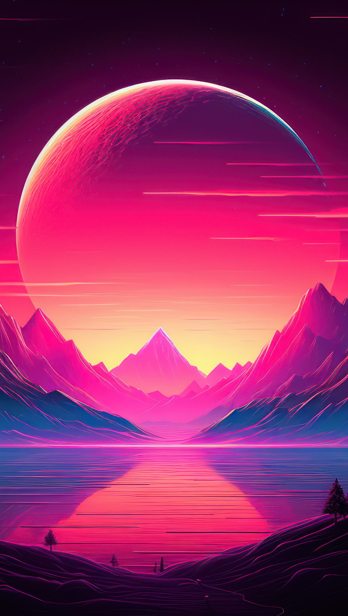 A mesmerizing 4K wallpaper presents a nostalgic retrowave scene where the sun sets over majestic mountains, with hues of warm colors casting a vibrant glow across the landscape. Simply click the download button to bring this masterpiece to life on your screen as a desktop wallpaper or save it for later in your wallpaper collection.