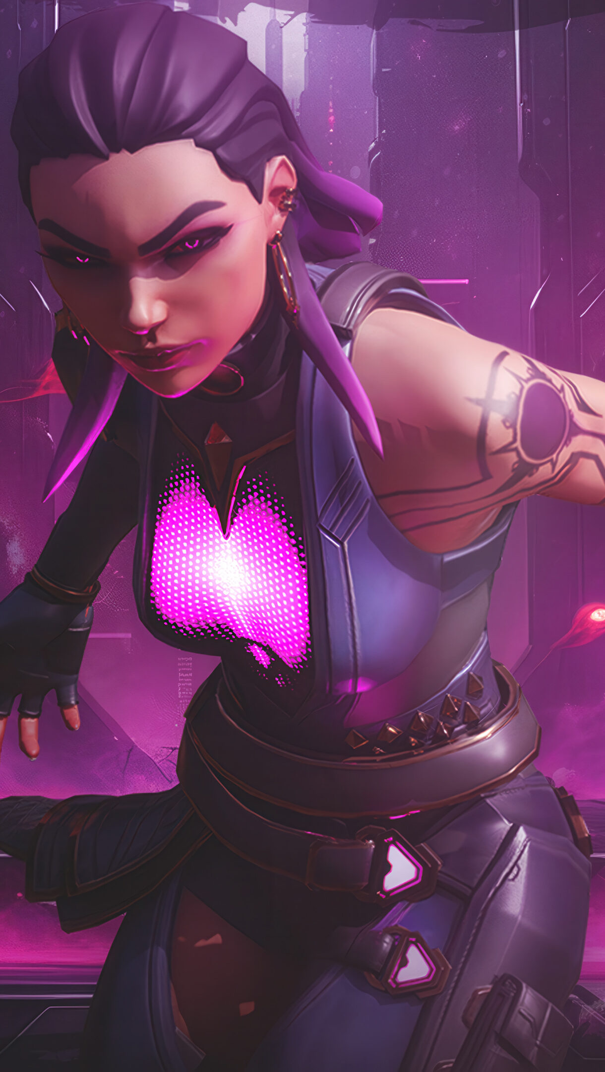 A powerful 4K wallpaper featuring Reyna from Valorant in a dynamic, aggressive pose, set against a dark, ethereal landscape illuminated by glowing purple and red energy. The striking contrast of her brightly glowing, heart-shaped chest and the ominous red eyes in the background establishes a formidable and mystical mood.