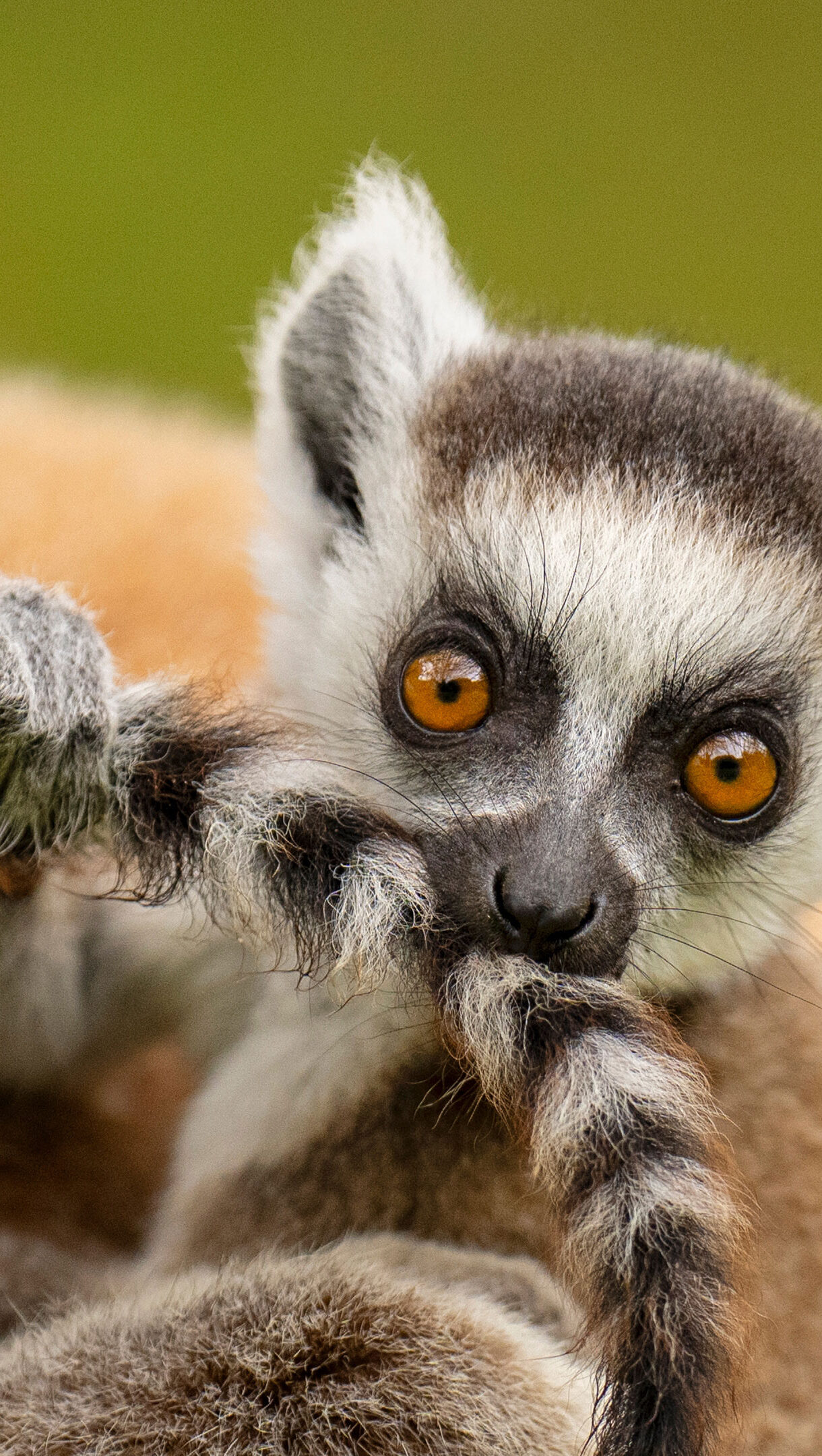 An endearing 4K wallpaper showcases a curious Ring-tailed Lemur infant in close-up, nestled on a parent's back against a soft green Madagascan backdrop. Its piercing orange eyes and an innocent, gentle expression as it holds its striped tail define a heartwarming and intimate mood.
