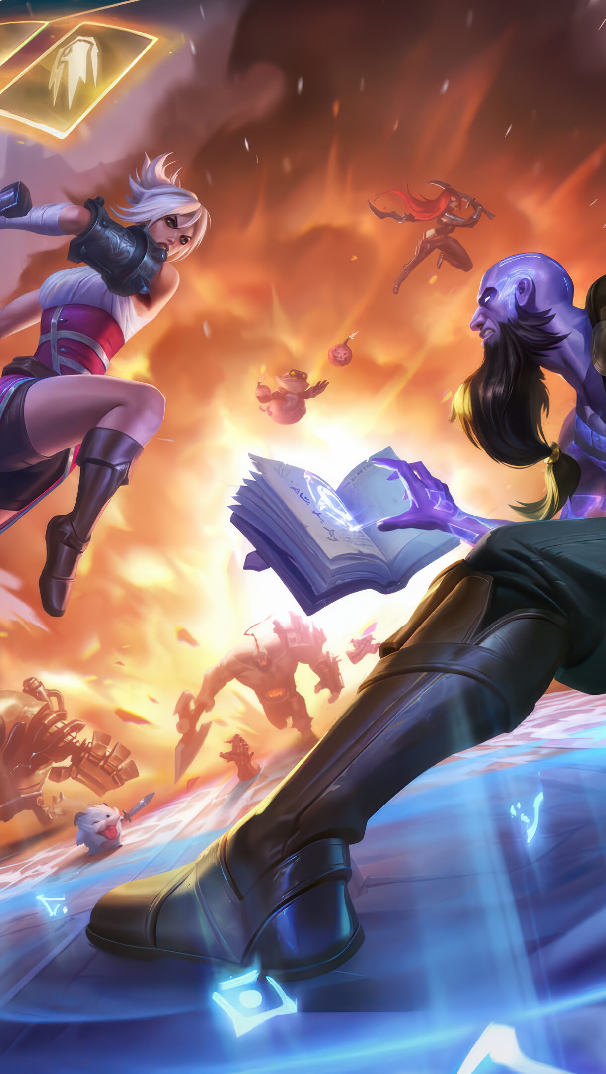 A mesmerizing 4K wallpaper showcasing the intense confrontation between Riven and Ryze in a chaotic, half-frozen, half-fiery arena. The dramatic interplay of Riven's fiery orange backdrop and glowing green sword against Ryze's cool blue magical aura and radiating purple runes defines the image's electrifying, high-stakes mood.