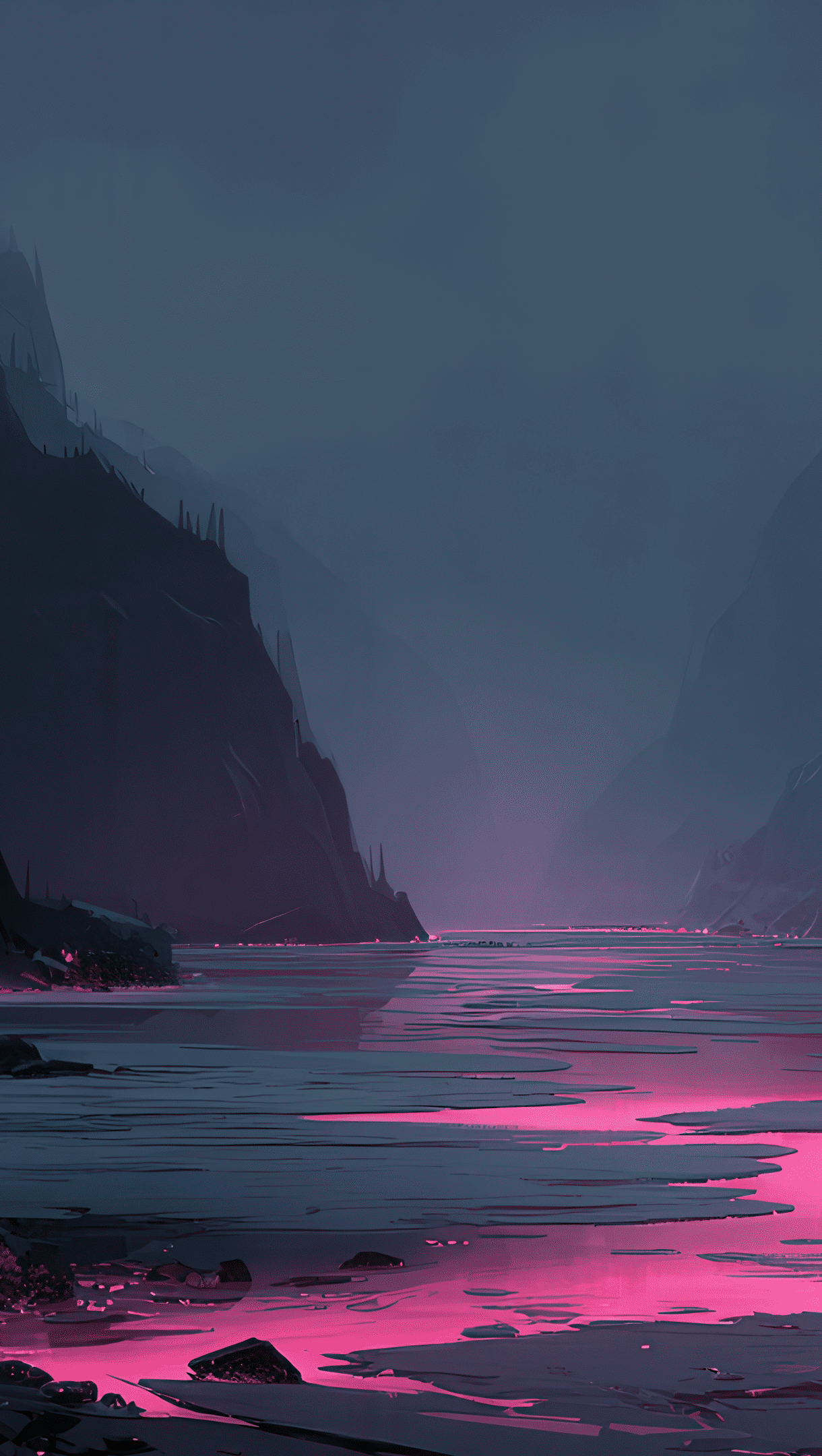 A surreal 4K wallpaper depicting a dark canyon carved by a glowing pink river. The vibrant magenta light of the river cuts through the deep blue gloom, creating an otherworldly and dramatic atmosphere.