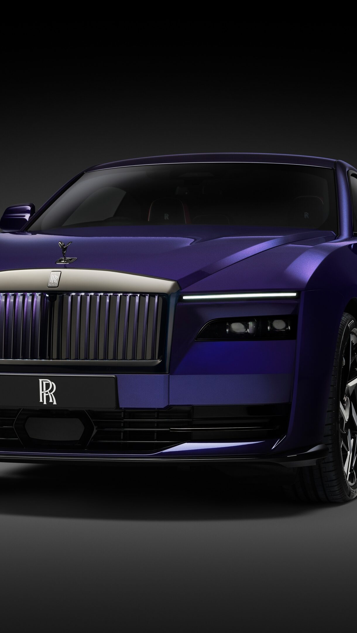 A high-resolution 4K wallpaper featuring the Rolls-Royce Black Badge Spectre 2025, a luxurious all-electric coupe with a sleek black exterior, illuminated grille, and elegant design, set against a dramatic background.