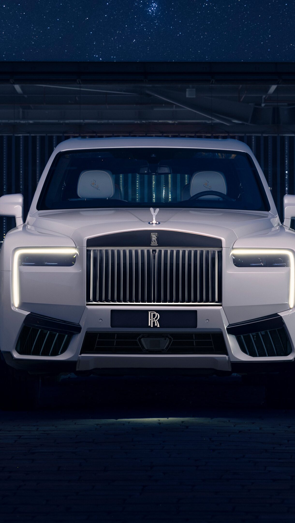 A celestial 4K wallpaper showcasing a pristine white Rolls-Royce Cullinan SUV parked head-on at night beneath a brilliant, star-studded cosmos. Its illuminated grille and prominent daytime running lights pierce the serene darkness, complemented by subtle reflections on the paved surface and the elegant architecture in the background.