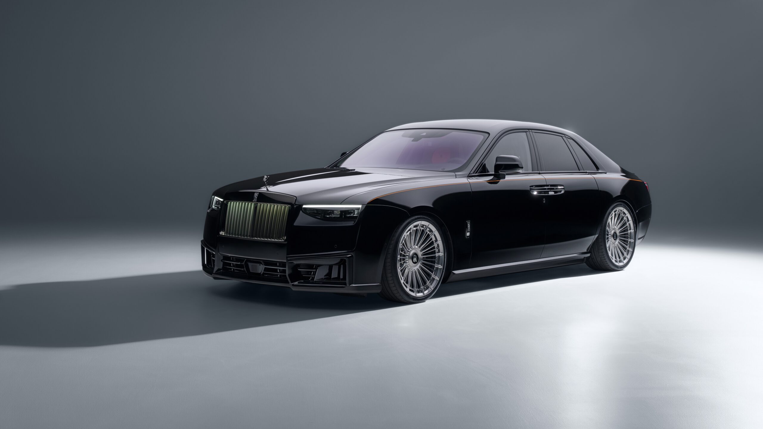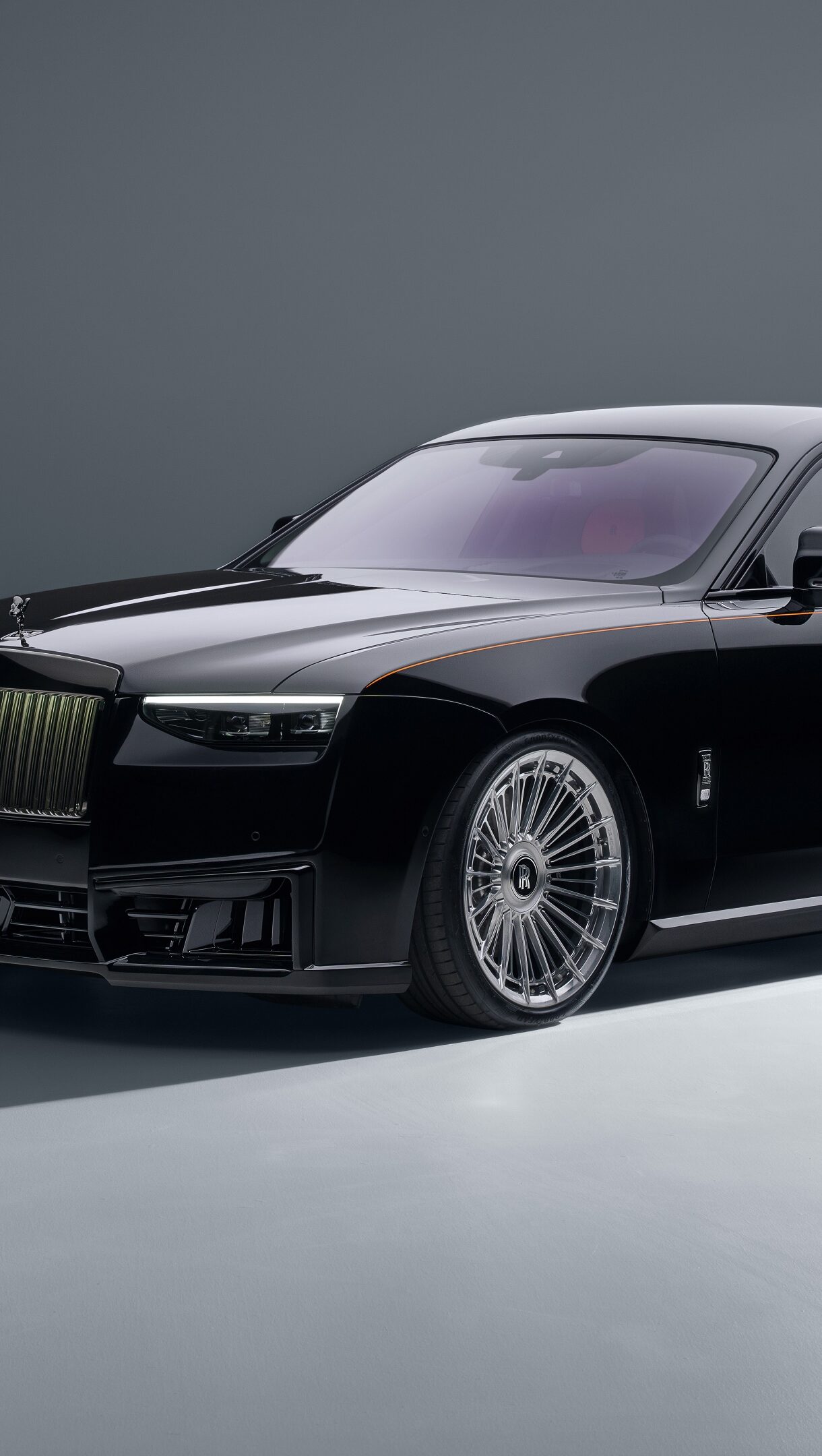A sophisticated 4K wallpaper featuring a Rolls-Royce Ghost luxury sedan in glossy black, artfully displayed in a minimalist studio against a cool grey backdrop. Its prominent gold grille and intricate chrome wheels sparkle, underscoring the car’s opulent design and refined presence.