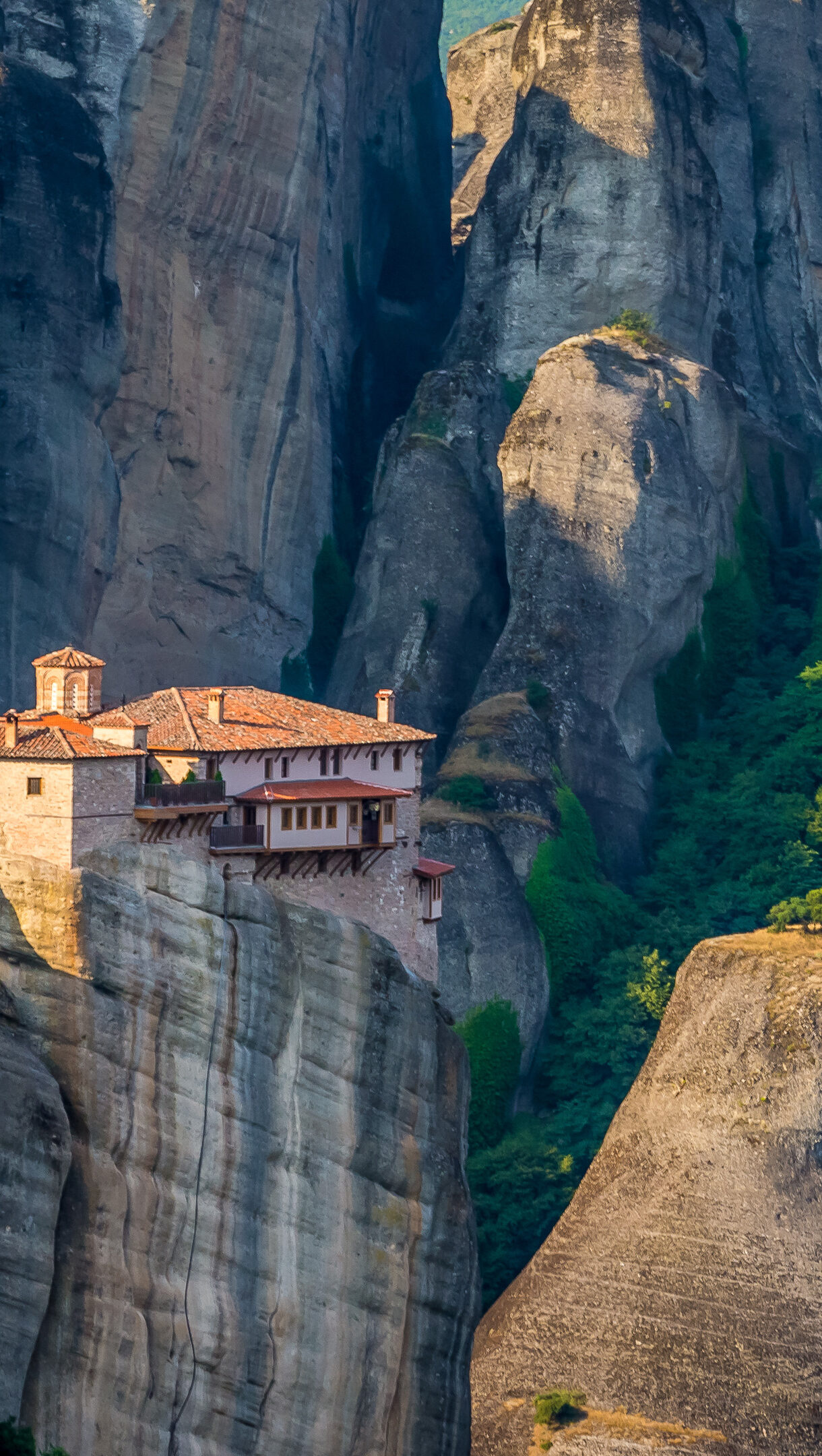 A breathtaking 4K wallpaper depicting Roussanou Monastery perched precariously atop a towering rock pillar in the dramatic landscape of Meteora, Thessaly, Greece. Golden sunlight bathes the monastery's terracotta roofs and beige stone, contrasting dramatically with the vast, rugged gray rock faces and deep green foliage that characterize the unique Meteora landscape, conveying a profound sense of isolation and spiritual grandeur.