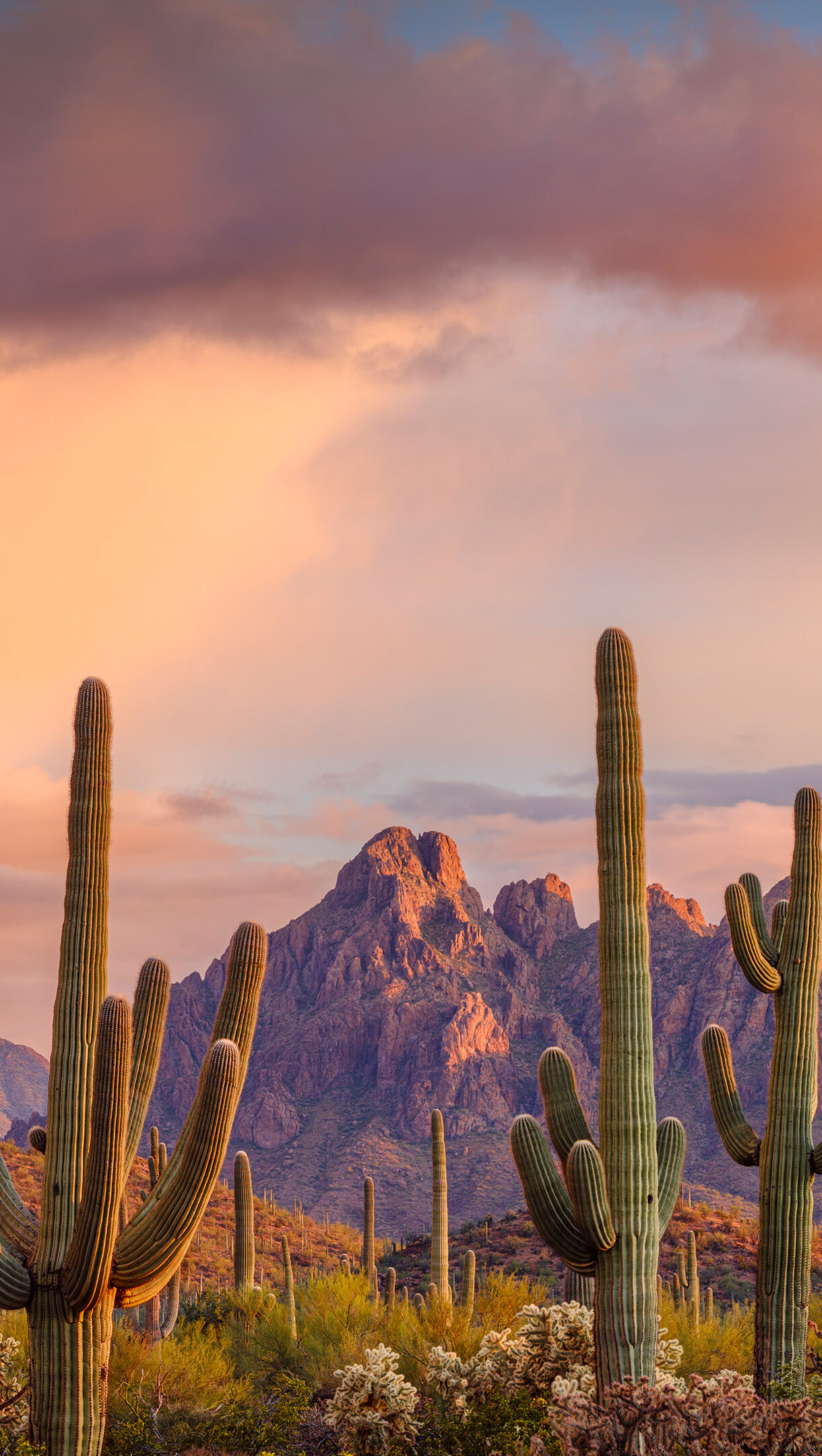A majestic 4K wallpaper showcasing Saguaro Cacti standing tall across the vast desert landscape of Ironwood National Monument in Arizona at sunset. The sky glows with vibrant shades of orange, pink, and purple, bathing the rugged mountains and the textured Saguaros in a serene, golden light.