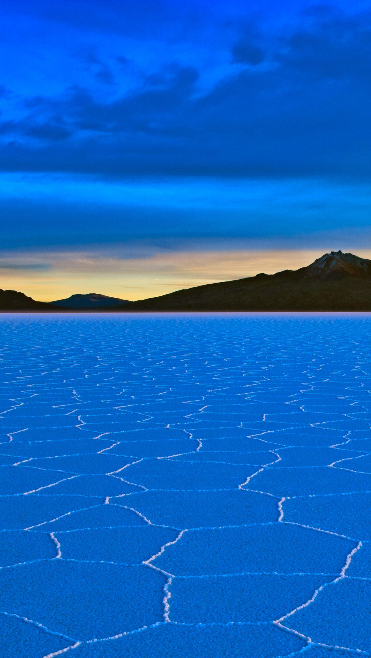 An immersive 4K wallpaper showcasing the Salar de Uyuni in Bolivia, featuring a vast, intensely blue salt flat stretching towards distant mountains under a dramatic sky. The captivating hexagonal patterns on the vivid azure ground reflect the deep blue overhead, creating a serene and otherworldly landscape touched by a subtle golden glow on the horizon.