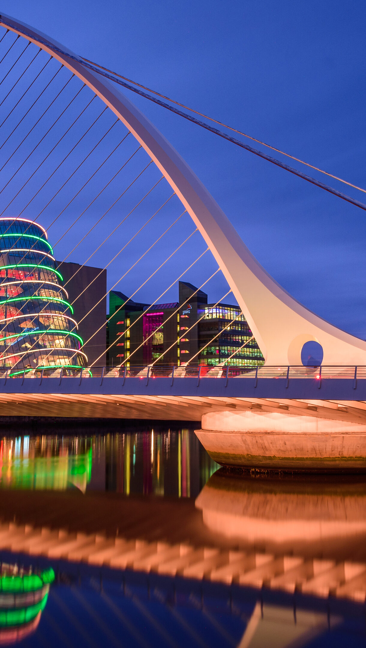 A breathtaking 4K wallpaper showcasing the Samuel Beckett Bridge gracefully arching over the River Liffey in Dublin, surrounded by the glow of the night cityscape. Its distinctive harp-like structure is vibrantly illuminated, casting stunning, colorful reflections of itself and the modern buildings onto the tranquil water.