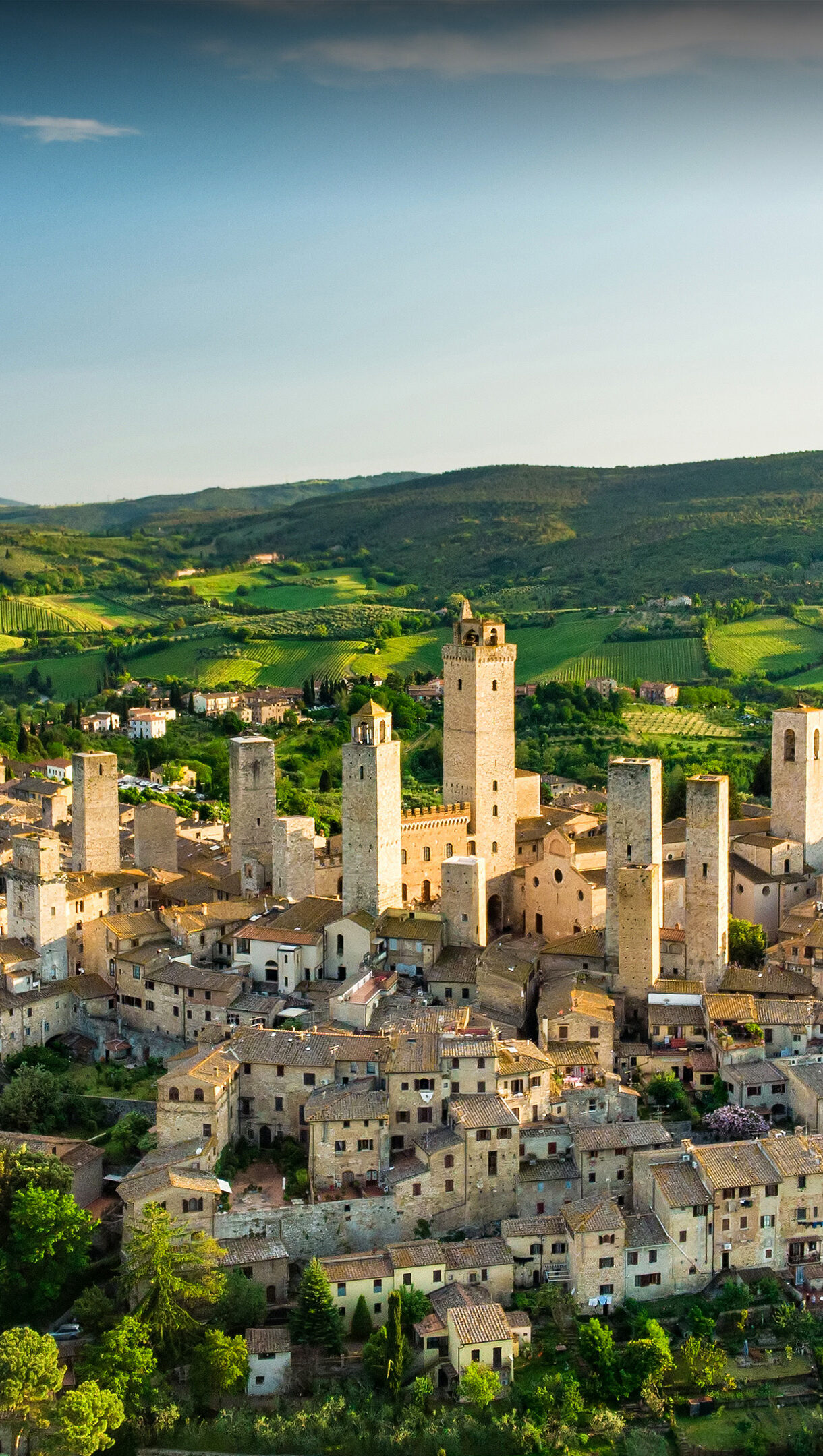 An exquisite 4K wallpaper showcasing the ancient town of San Gimignano with its historic towers rising prominently from a hilltop, nestled within the sprawling, verdant landscape of Siena, Tuscany. Golden afternoon light bathes the medieval stone buildings and their tall structures, creating a stunning contrast with the vibrant green vineyards and rolling hills under a serene blue sky.