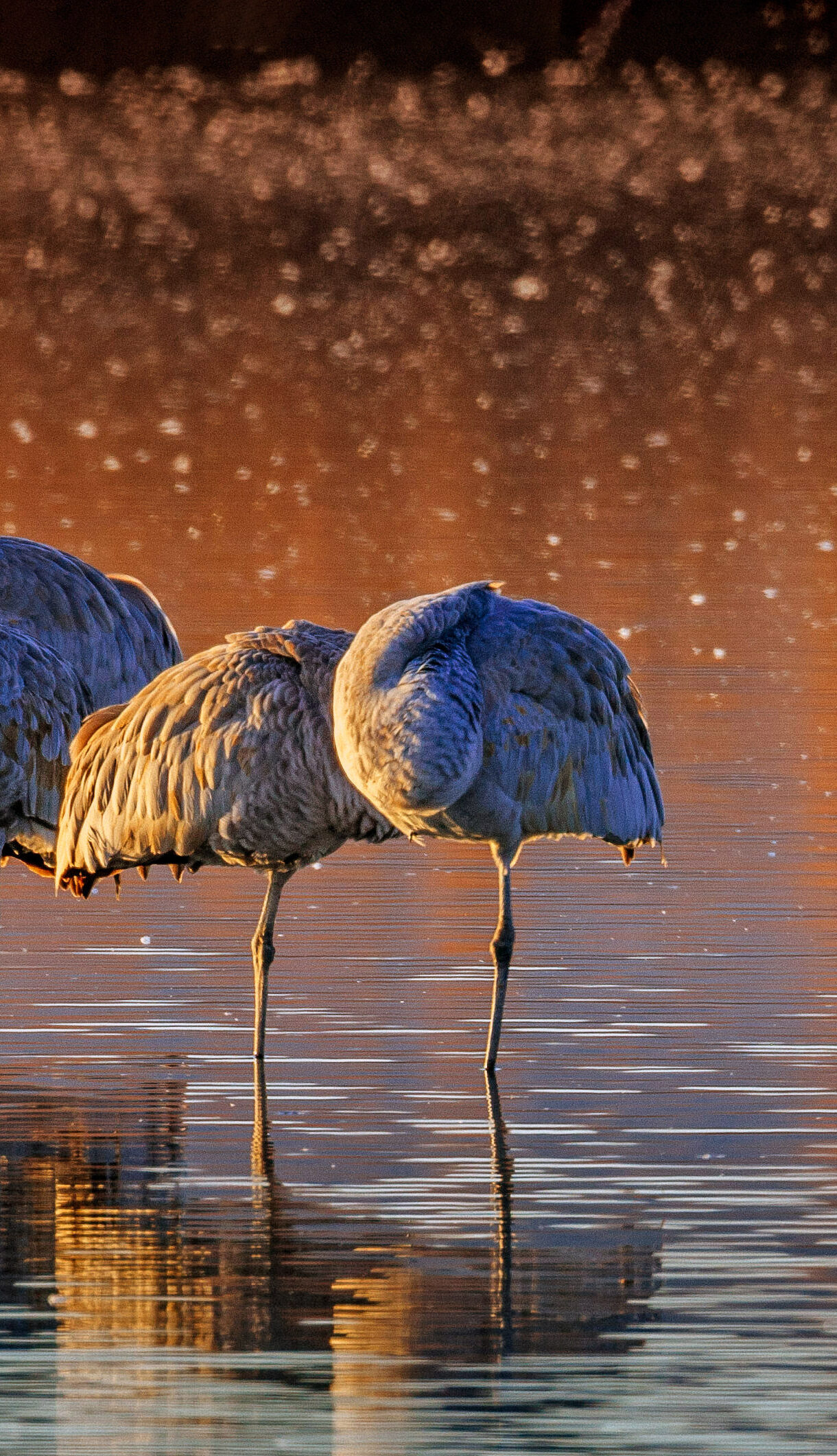 An enchanting 4K wallpaper presenting Sandhill Cranes at Bosque del Apache National Wildlife Refuge, New Mexico, during golden hour. The radiant light bathes the resting cranes in a warm glow, creating shimmering reflections on the tranquil water and a soft, luminous bokeh backdrop.