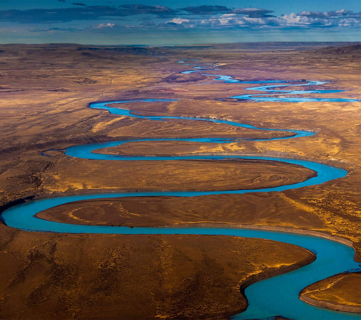 An expansive 4K wallpaper revealing the Santa Cruz River winding through the vast, arid Patagonian landscape of Argentina. Its vibrant turquoise waters cut a dramatic, serpentine path across the golden-brown plains, creating a stunning visual contrast under a partly cloudy sky.