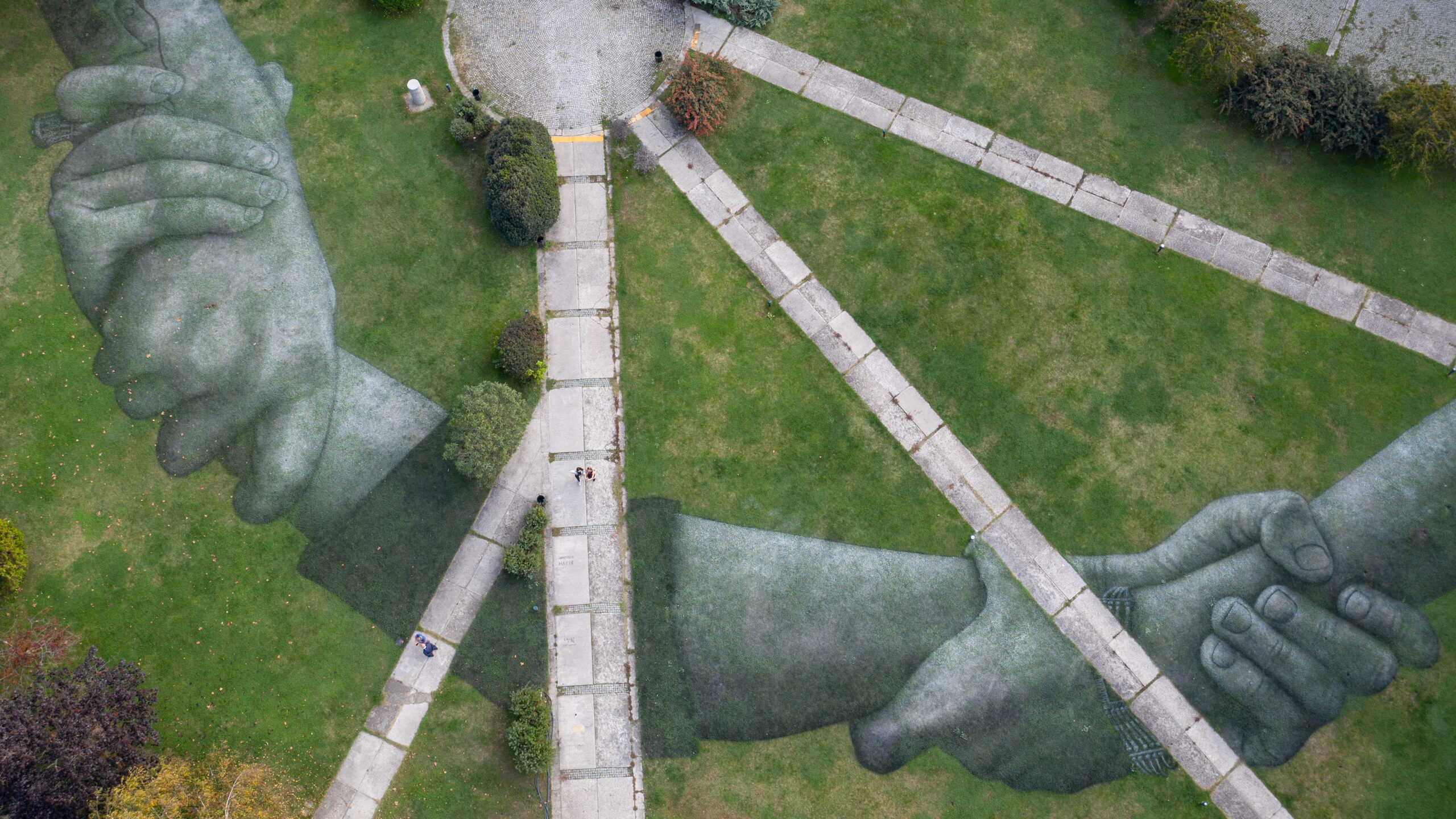 A panoramic 4K wallpaper presenting Saype's Land Art Fresco of intertwined hands in Istanbul, Türkiye. This striking aerial view showcases two colossal hands, painted directly onto the expansive green park grass, conveying a powerful message of unity and human connection through their subtle, earthy tones.