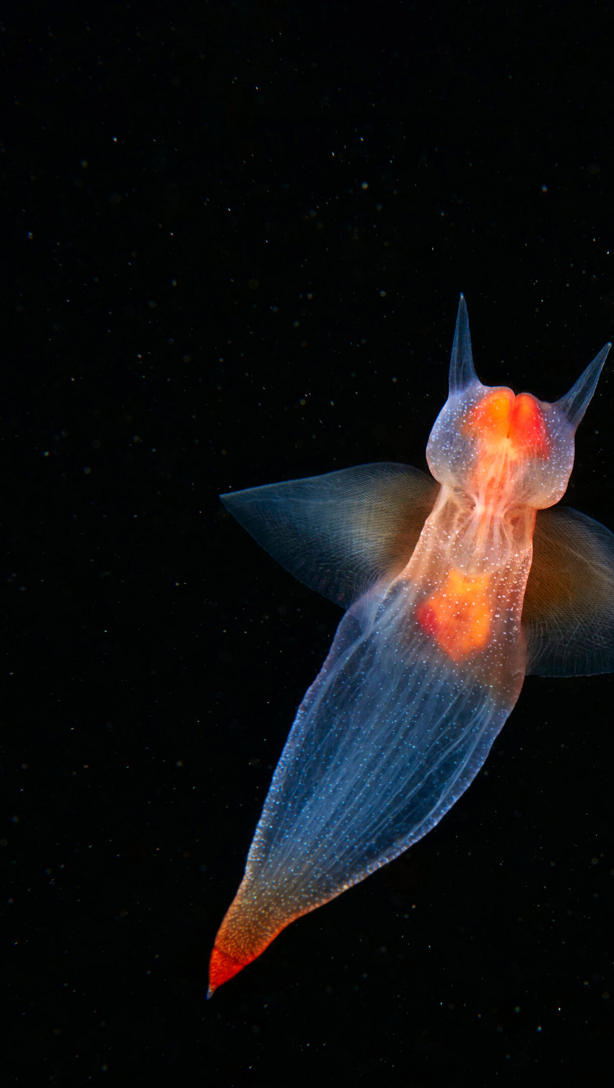 An ethereal 4K wallpaper presents a translucent Sea Angel, Clione limacina, gracefully suspended in the dark, vast underwater environment. Its delicate, wing-like fins and glowing orange internal organs create a stark, beautiful contrast against the abyssal blackness, evoking a sense of fragile wonder.