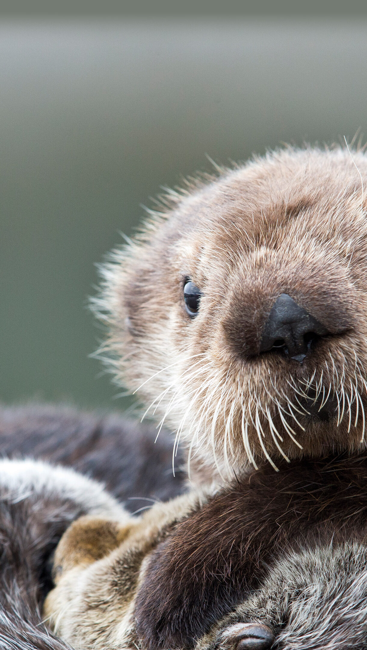 A captivating 4K wallpaper showcases a fluffy sea otter pup in Prince William Sound, Alaska, snuggled close to another otter against a muted, soft background. The pup's bright, curious eyes and soft, detailed whiskers are the focus, evoking a sense of warmth and innocent wonder in this intimate wildlife portrait.