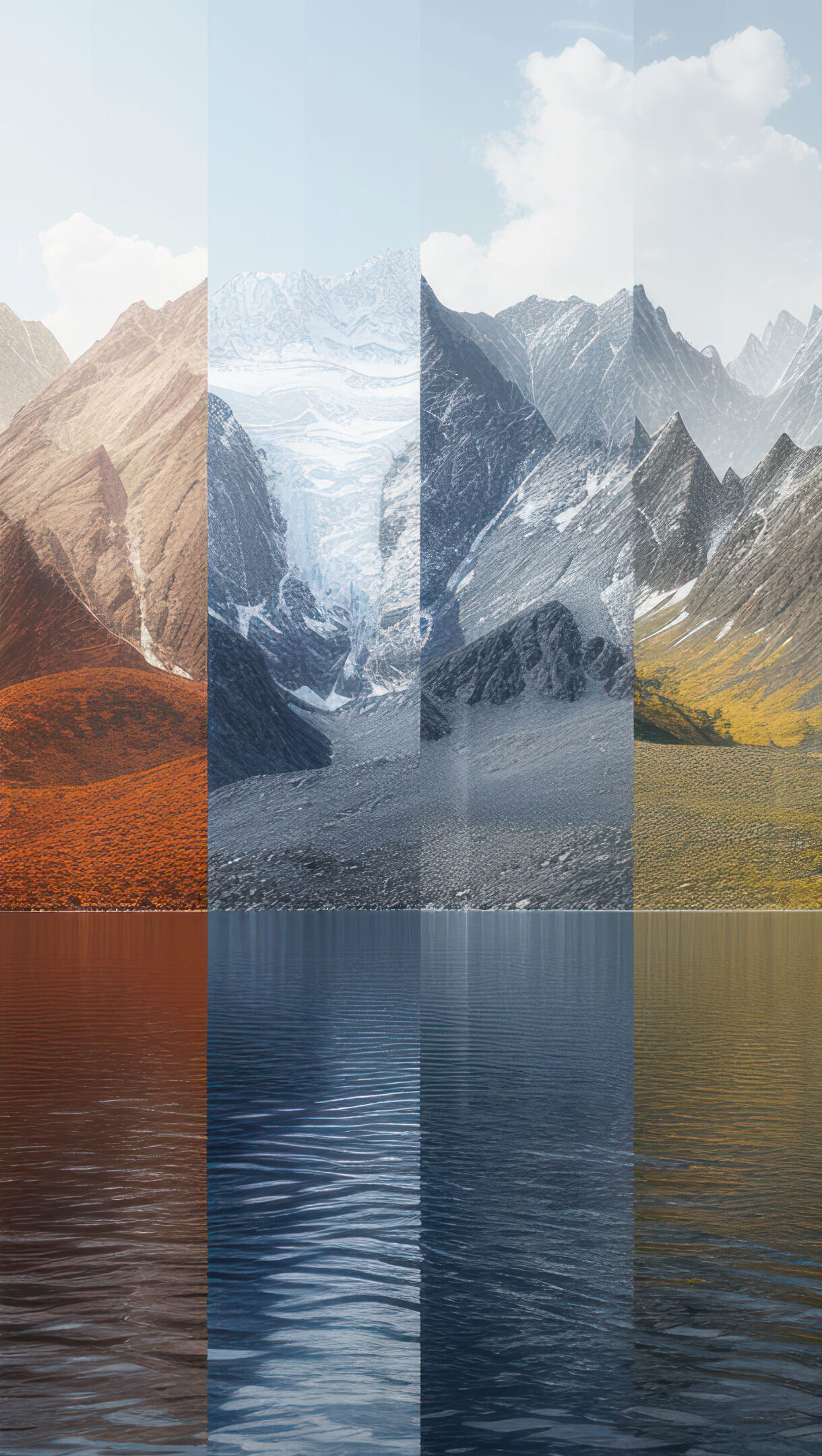 Immerse yourself in the beauty of changing seasons with this AI-generated 4K wallpaper featuring a segmented mountain lake. Although not a direct representation, the digital art composition captures the essence of nature's transformations, creating a visually captivating experience for high-resolution displays. Simply click the download button to bring this masterpiece to life on your screen as a desktop wallpaper or save it for later in your wallpaper collection.